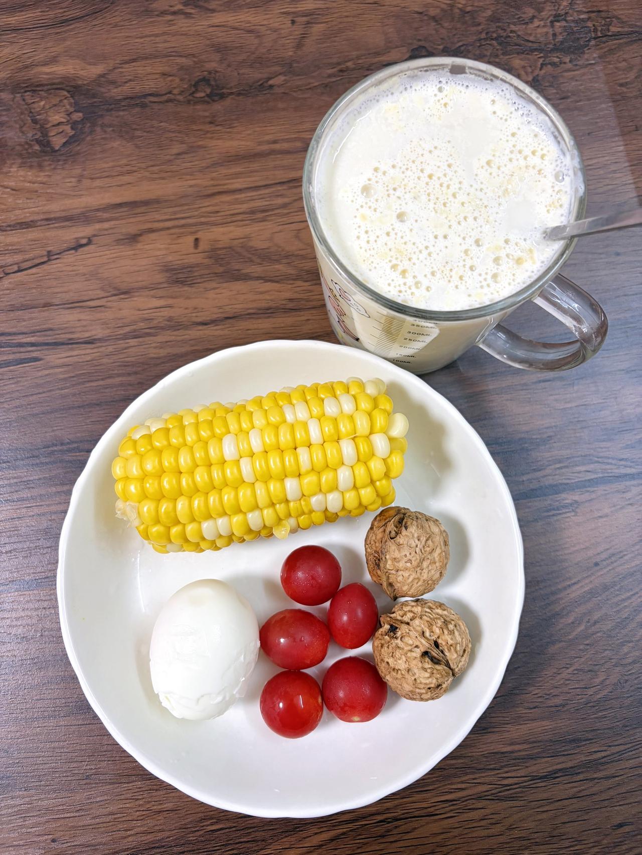 今日减脂早餐:玉米+鸡蛋+番茄+核桃+豆浆