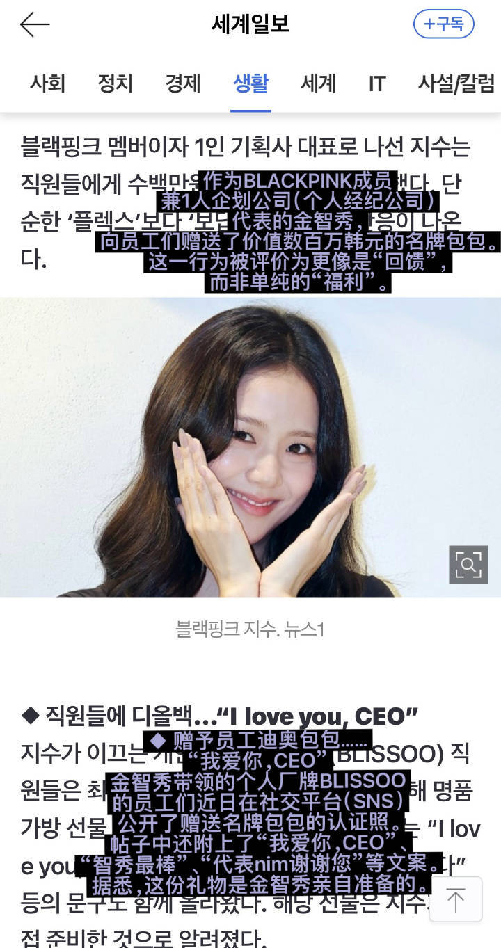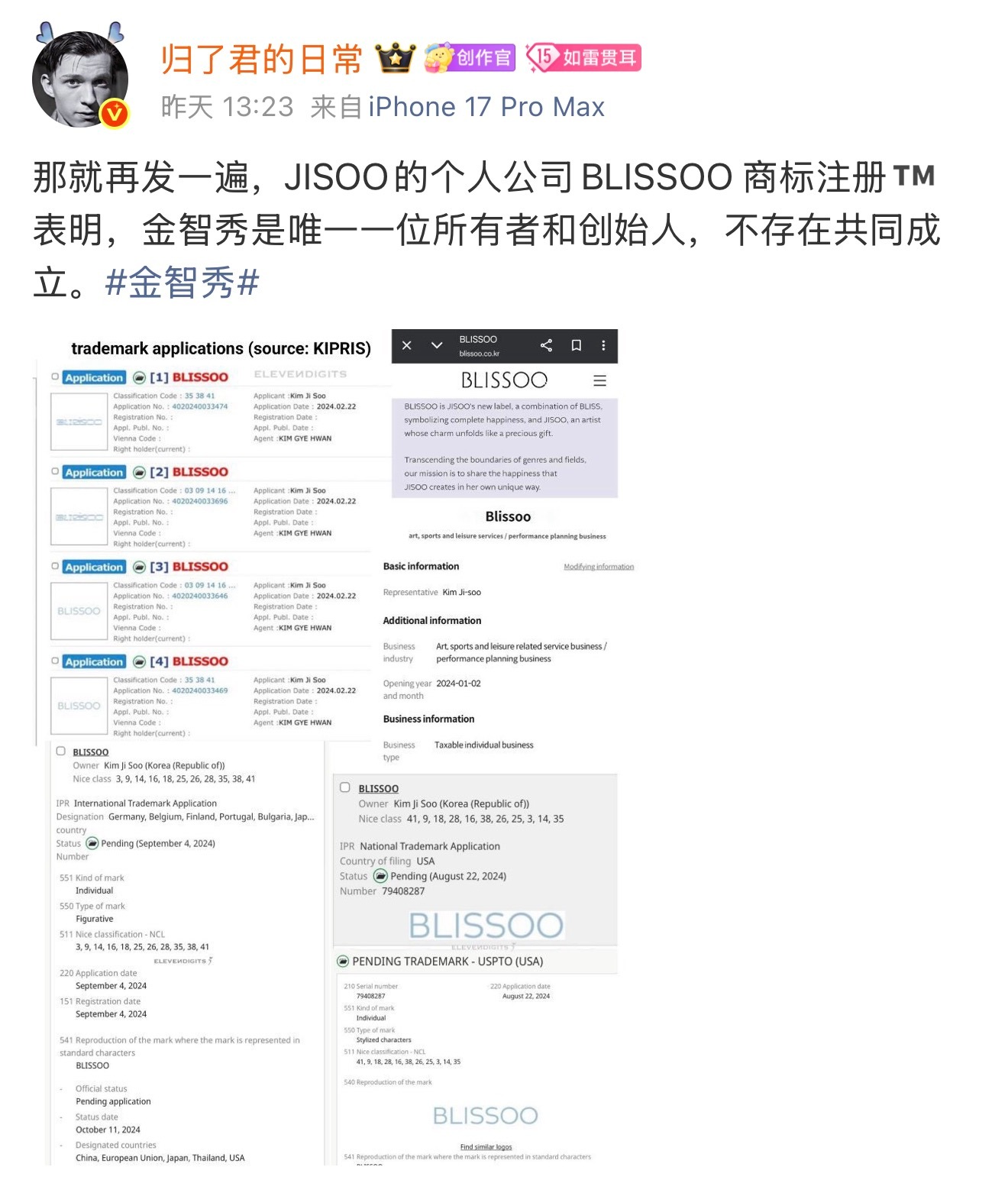 还是把重点放到事情本身,别牵扯无辜女爱豆了吧,另外blissoo是金智秀自己创建的公司,法人是自己,核心业务也只围绕自己,团队大部分都是女性员工,金智秀还会和因怀孕远离职场的女摄影师多次合作提供工作机会,出道多年人品如何不管是业内还是线下粉丝都有见证。 jisoo的哥哥已婚