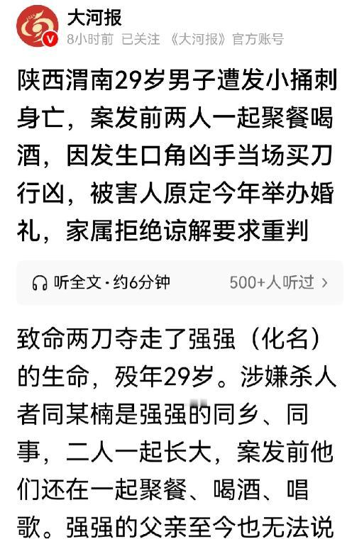 陕西渭南,一29岁男子,和从小一起长大的发小聚餐喝酒,两人发生了几句口角,对方当场去便利店买了把水果刀,朝他胸口连捅两刀,男子经抢救无效后离世。被害人原本今年就要办婚礼,家属拒绝任何谅解,只要求重判。