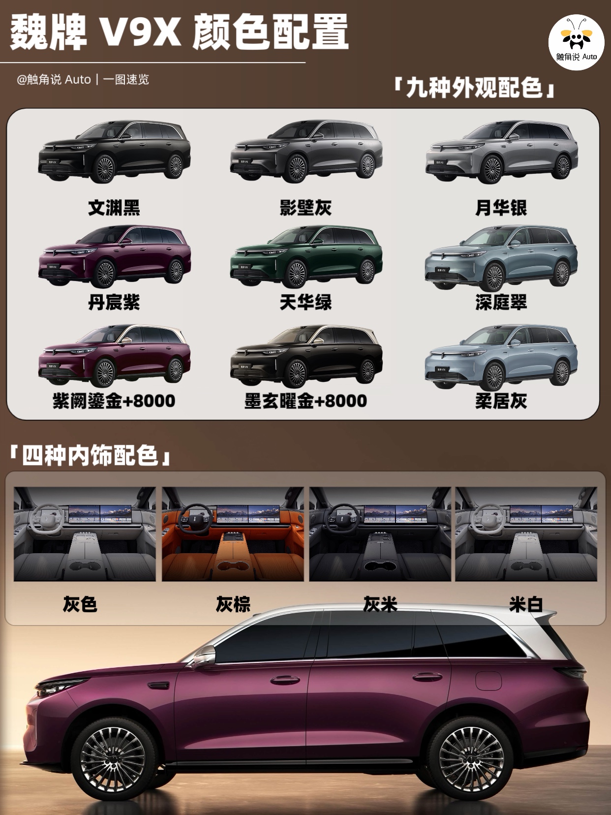 4月17日,魏牌V9X正式开启预售,共推出3款车型,预售价区间为37.18-41.18万元。新车作为归元S平台打造的首款车型,定位大型豪华插混SUV,配备2.0T发动机+4挡混动专用变速箱+800V高压架构+6C超充的混动技术方案,最大纯电续航470km,综合续航1700km。同时,魏牌V9X还将搭载小魏同学行车智能体以及小魏同学座舱智能体,进一步丰富智能体验。