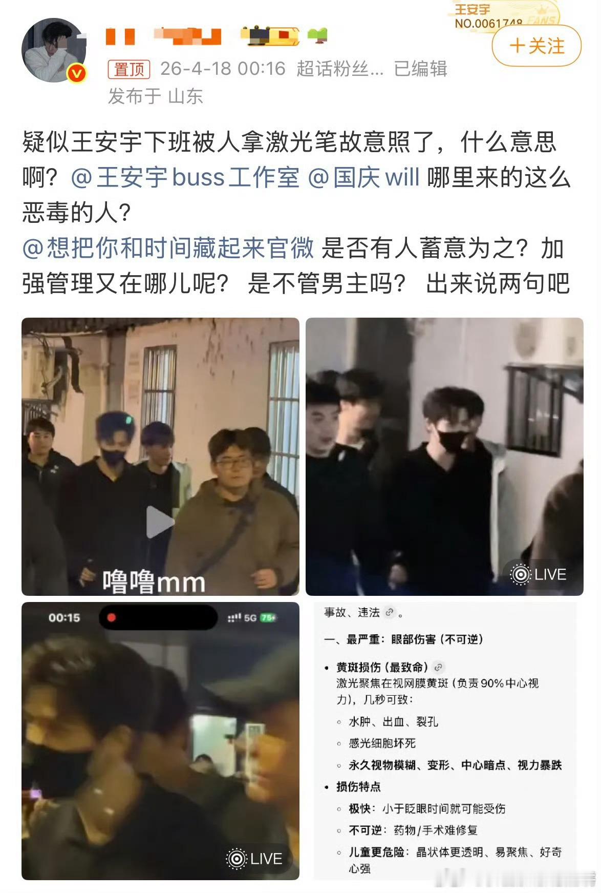 妈啊,王安宇下班疑似被激光笔照了,目前粉丝开始维权