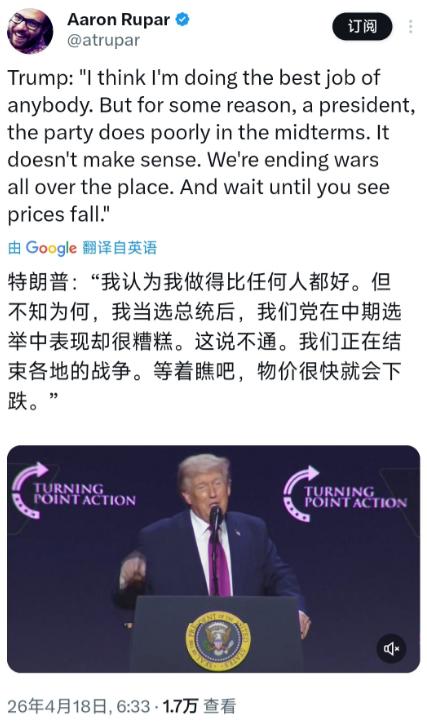 至于他说的物价很快会下跌,现在来看还没什么迹象。因为美国和以色列对伊朗的军事行动,霍尔木兹海峡的运输受到影响,美国汽油价格涨得厉害,化肥价格也翻了快一倍,农民春耕都受影响,后续食品价格可能还会上涨,这些民生问题,几乎都是共和党中期选举表现糟糕的重要原因。