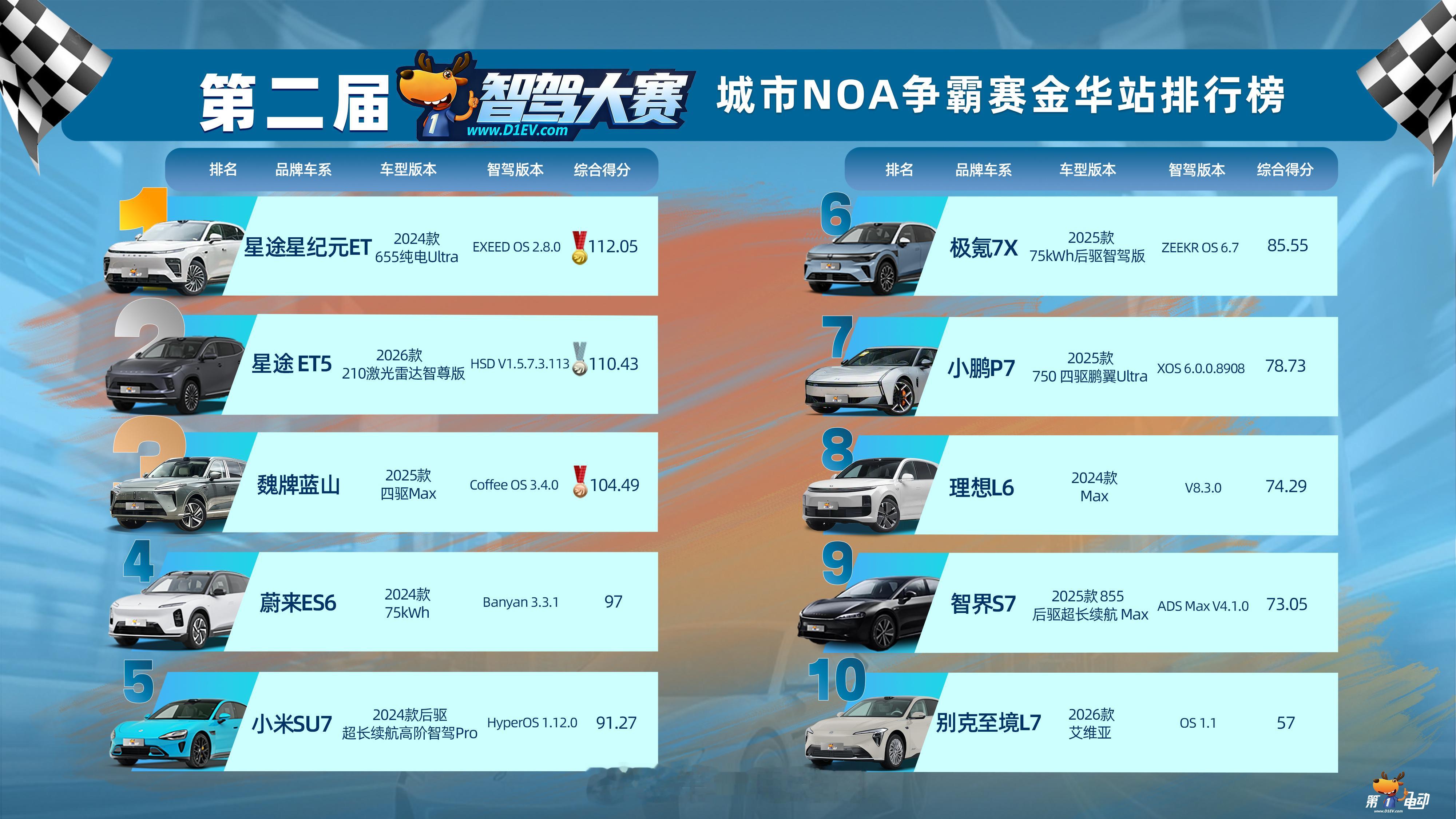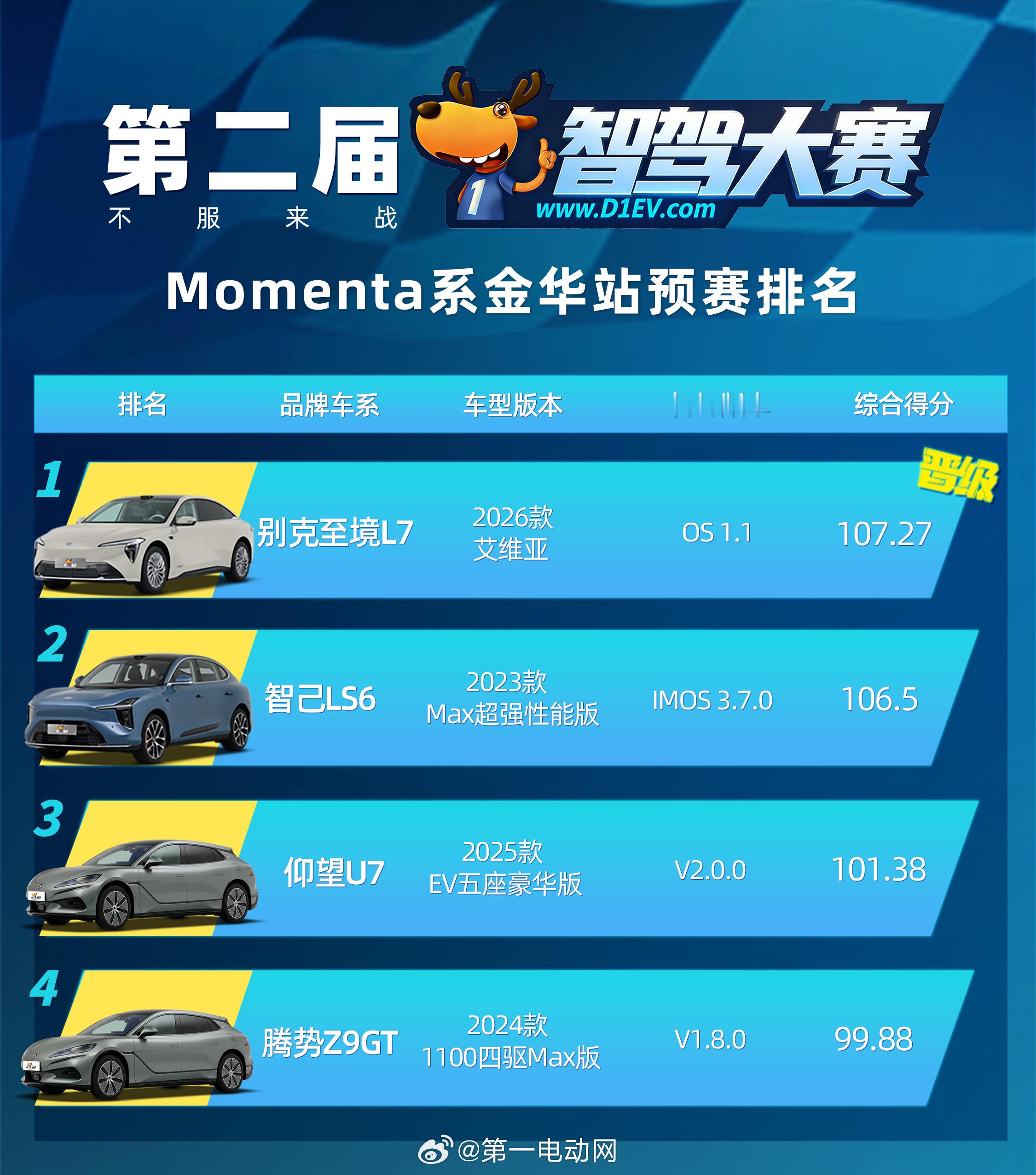 先来回顾一下金华站的成绩,前三名有2台奇瑞的车型来自不同的智驾方案,分别是博世文远和地平线HSD预赛Momenta系|别克至境L7 107.27分晋级智己LS6 106.5分|仰望U7 101.38分|腾势Z9GT 99.88分