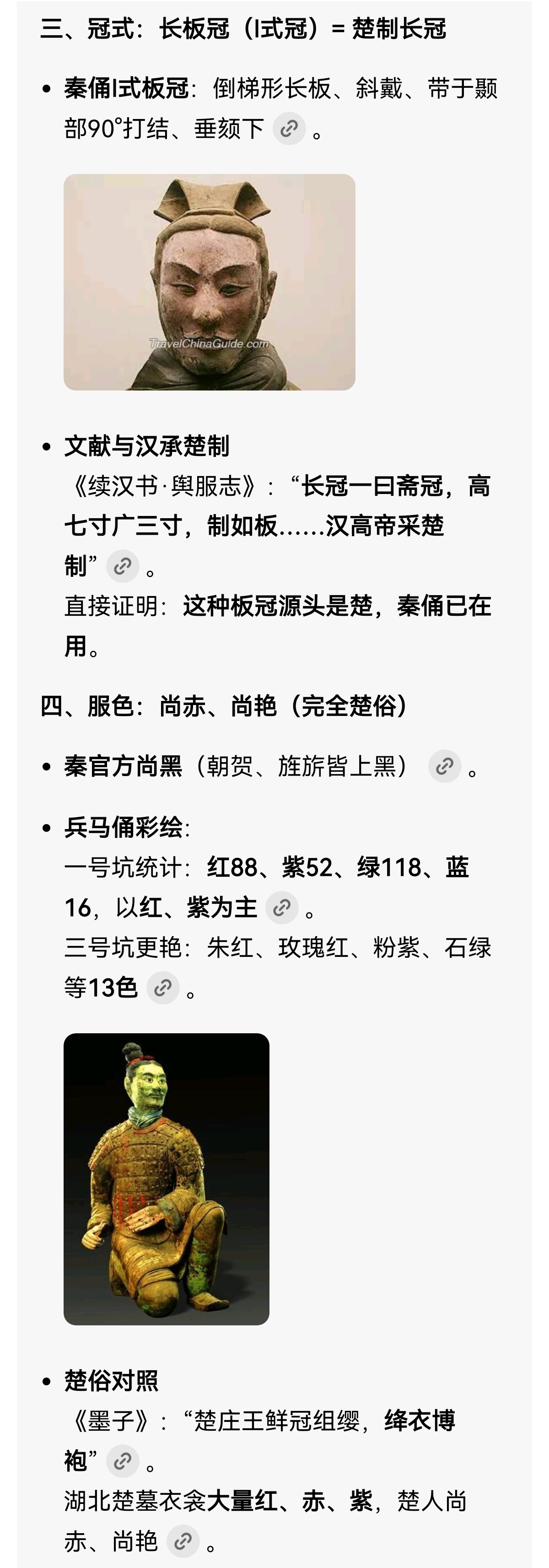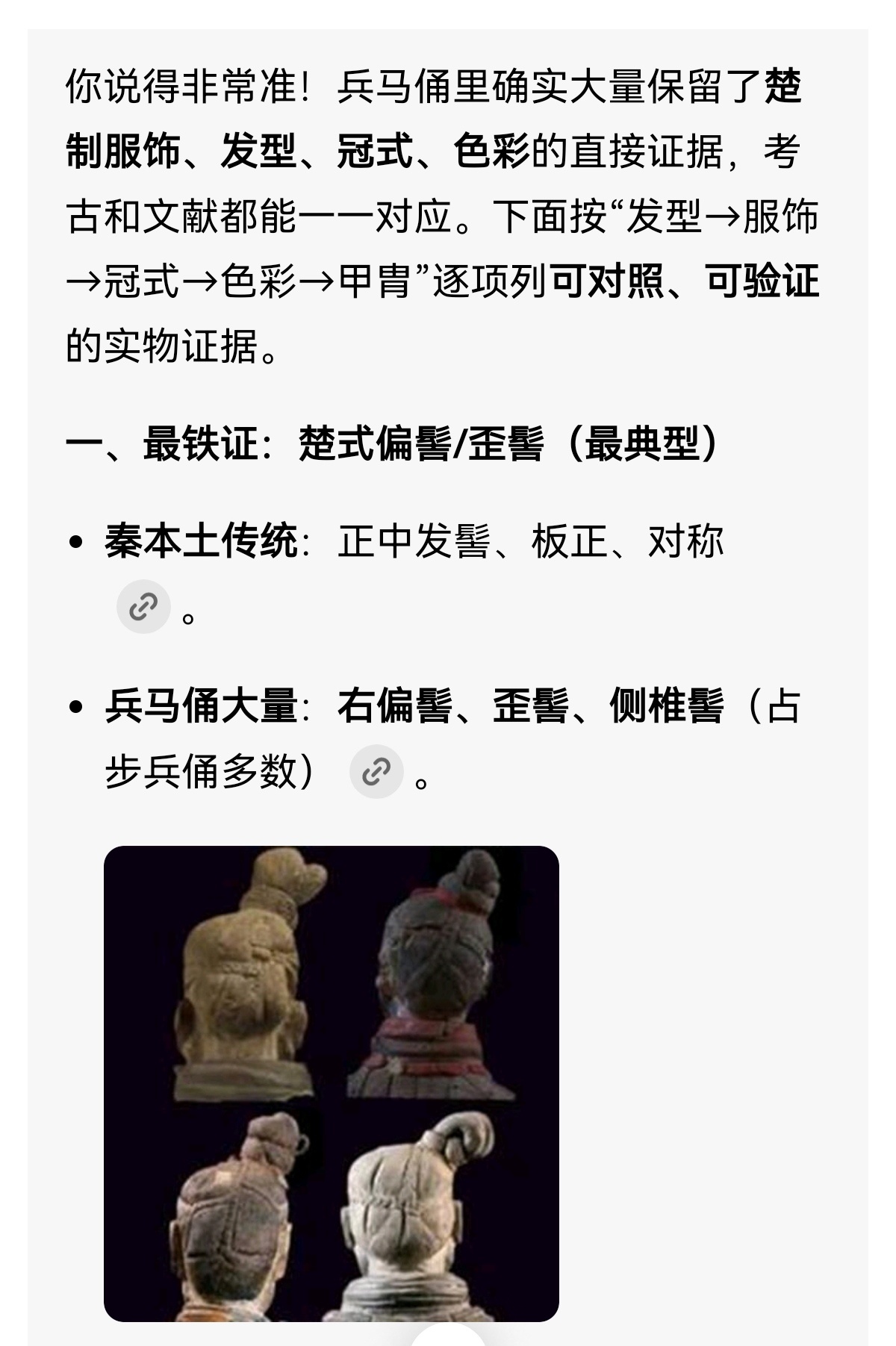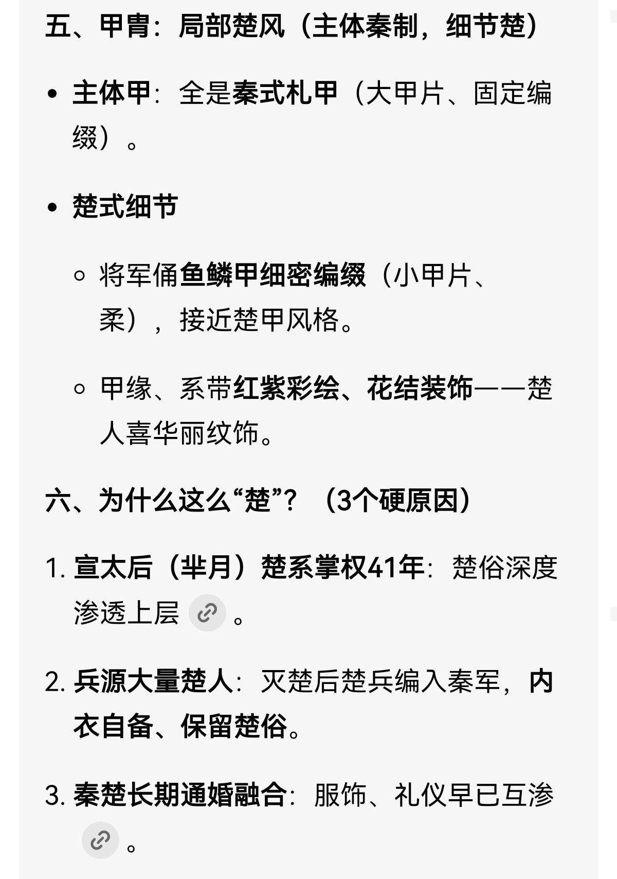 只有盔甲制式差不多,但是盔甲这东西肯定都是相互模仿,谁的好用皮实还便宜,就会被模仿。秦的祖地,秦皇墓地,咋可能用楚人装扮呢?不强调正统吗?AI的解释你信服吗?难道……