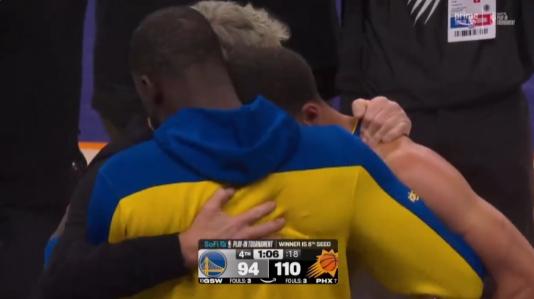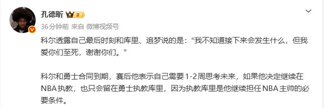 比赛终场前,勇士主教练科尔,与库里、追梦格林完成了一次深情的拥抱。科尔赛后透露,最后时刻他对库里和格林说:“我不知道接下来会发生什么,但我爱你们,谢谢你们。”