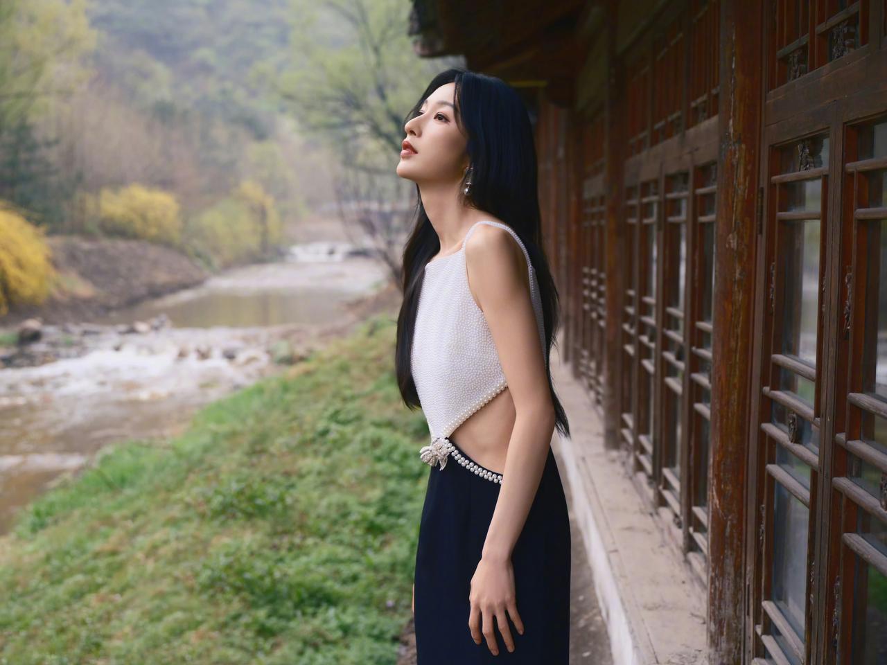 身着的造型简约又不失精致感,上半身的设计搭配腰部的蝴蝶结装饰尽显优雅,下半身的黑色裙装则增添了一份沉稳,整体造型展现出她独特的时尚品味与优雅气质。