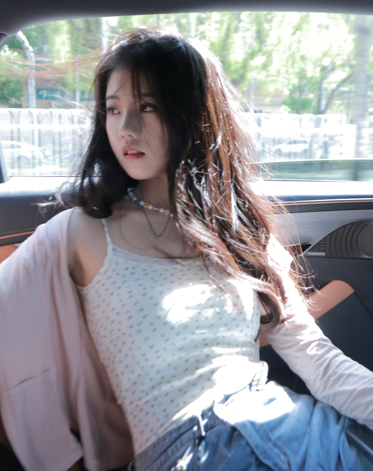 穿着带有波点的白色吊带、浅粉色开衫和蓝色牛仔裤,佩戴着彩色串珠项链,而头发自然垂落,整体氛围休闲随性。