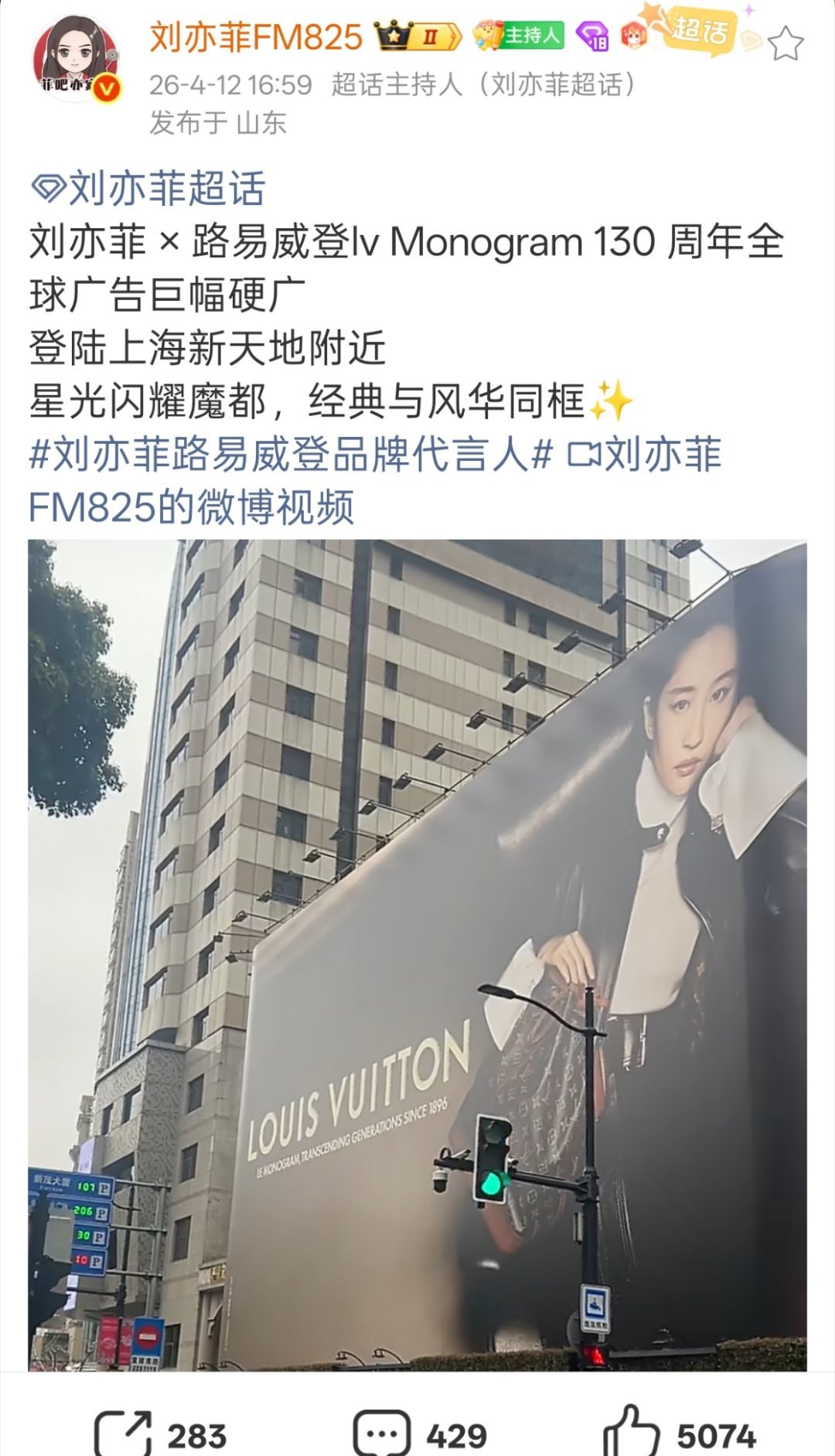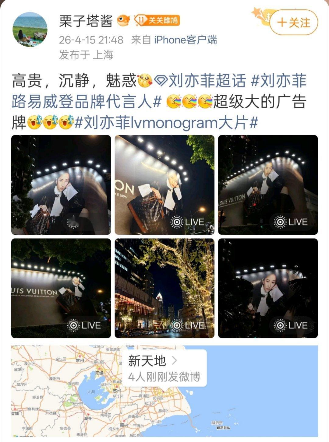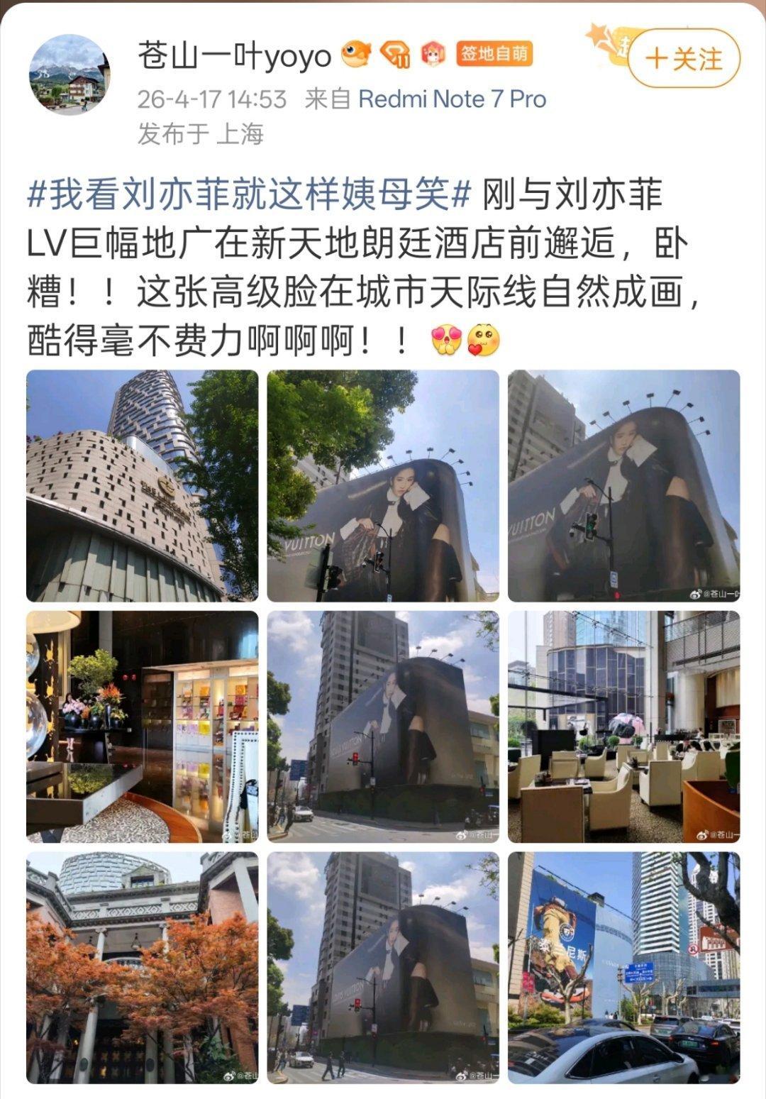 新天地附近刘亦菲LV大地广04.12路人打卡接下来04.13、04.15、04.17陆陆续续打卡,今天一周了