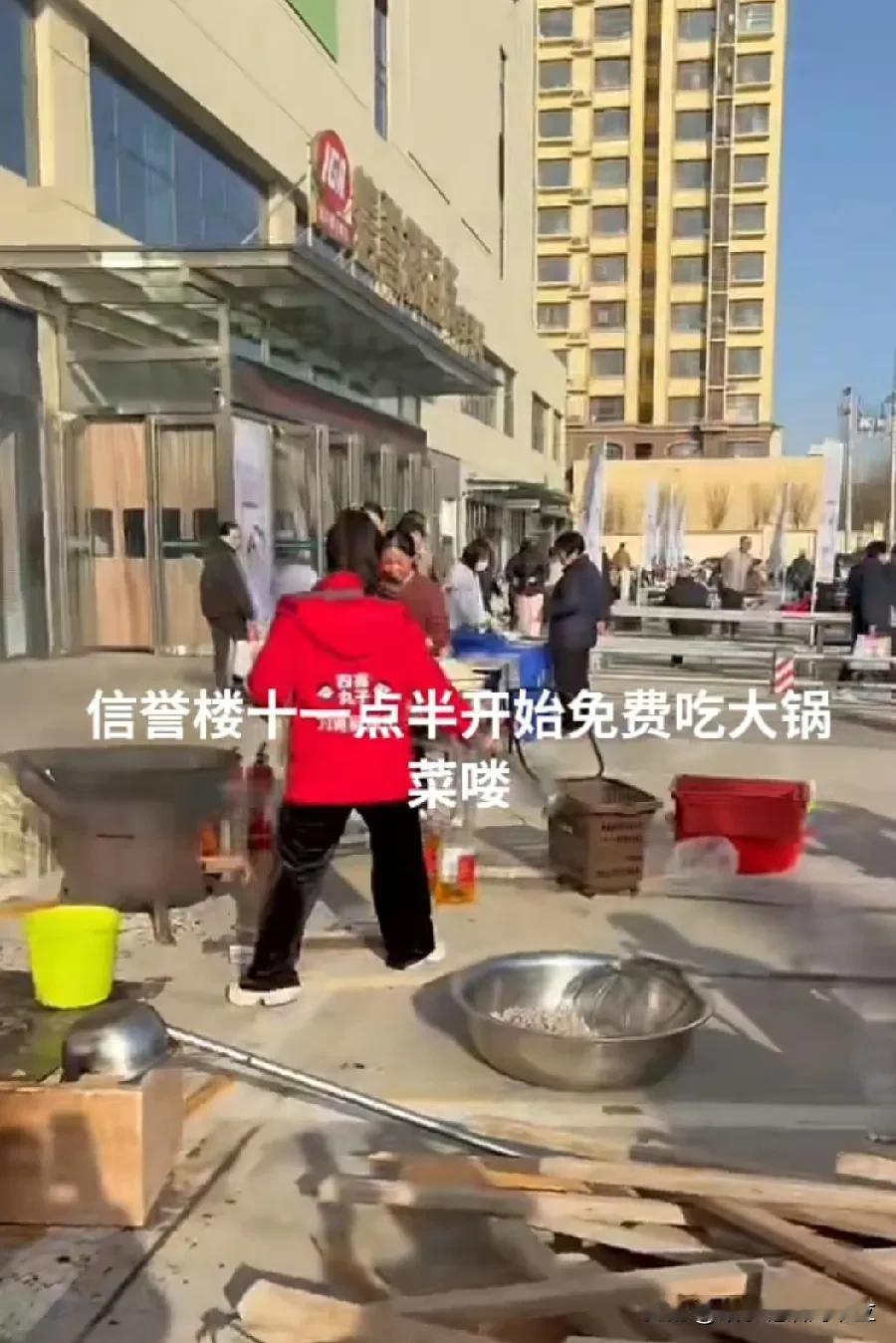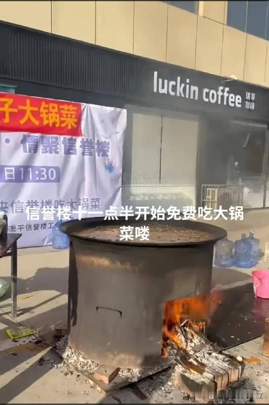这大锅菜都是真材实料,这可不是从哪里某个地方预制过来的,人家这都是现场做的,视频显示,就在商场外面一块空地上他们支锅埋灶,并从别处弄来大块的劈柴,呼呼的就把火点着了,真不玩虚的,这是说干就干啊。