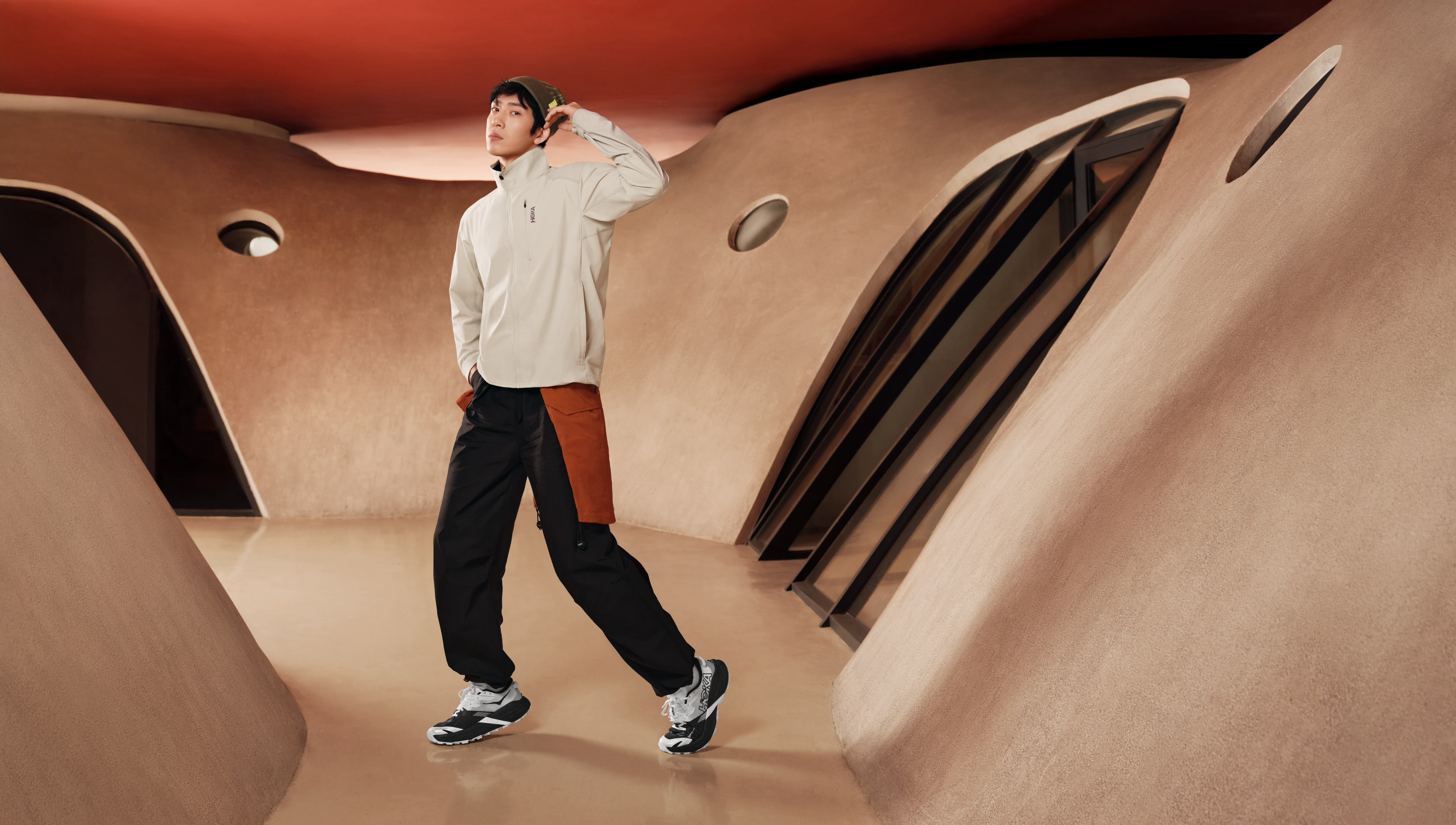 利落黑白鞋款,大胆搭配墨绿色机能外套,奠定整体松弛舒适的基调;腰间同色系格纹衬衫巧妙叠穿,丰富色彩深浅层次。另一套造型,则以黑白基础色系构建清爽姿态;裤间一抹棕橙成为点睛之笔,与背景温暖光影相得益彰,定格不费力的松弛野性。