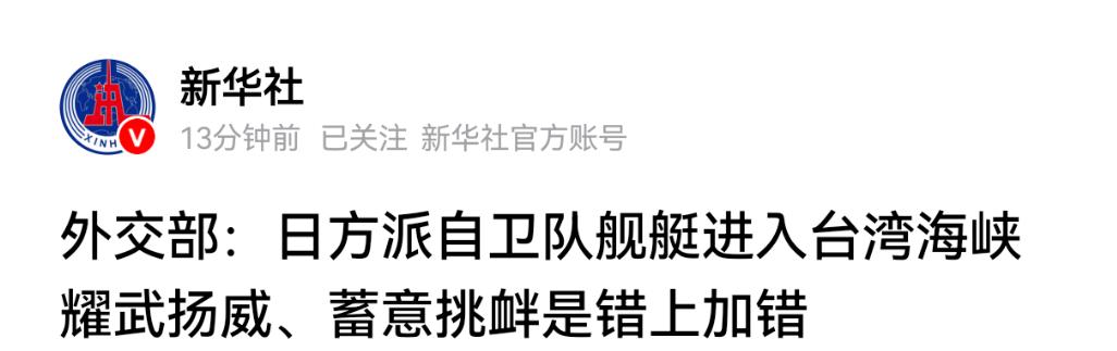 外交部发言人郭嘉昆直接用 "耀武扬威、蓄意挑衅,是错上加错" 来定性日本的行为,他明确指出,日本首相高市早苗此前已经发表过涉台错误言论,给中日关系带来了严重冲击,现在又派军舰到台湾海峡兴风作浪,这是一错再错。