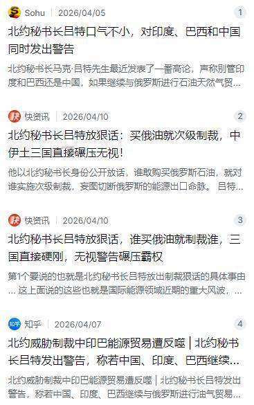 北约秘书长吕特发出警告:不管是印度、巴西还是中国,如果还继续跟俄罗斯交易石油和天然气的话,我们将对你们采取100%的次级税制裁。