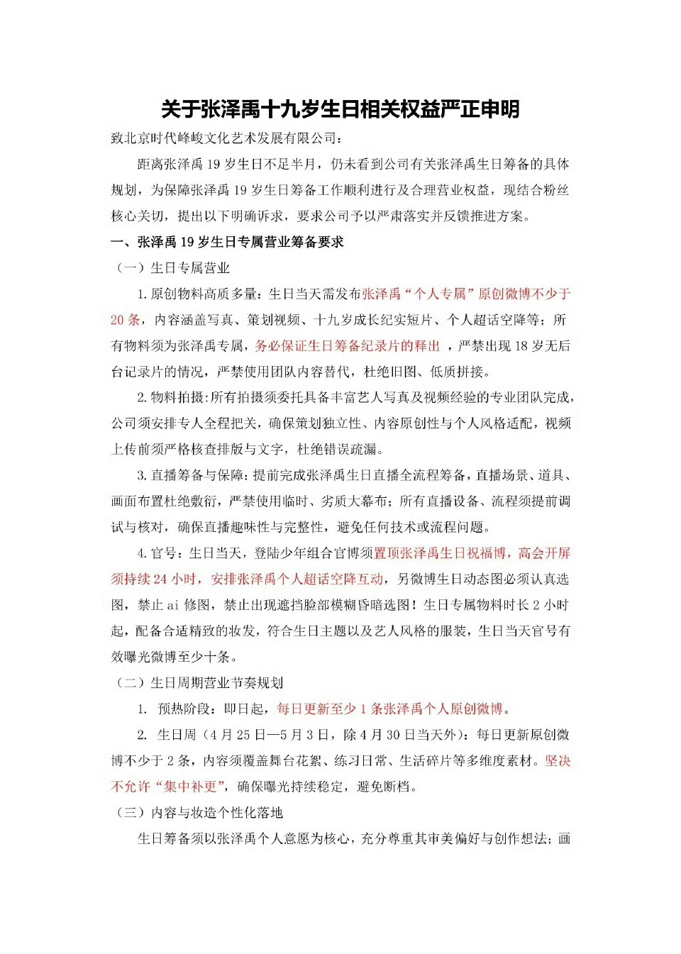 粉丝要求公司筹备张泽禹19岁生日张泽禹19岁生日专属营业筹备要求整个四月营业被一扣再扣,生日临近毫无动静,用心对待很难吗?请正视张泽禹与粉丝的合理诉求!