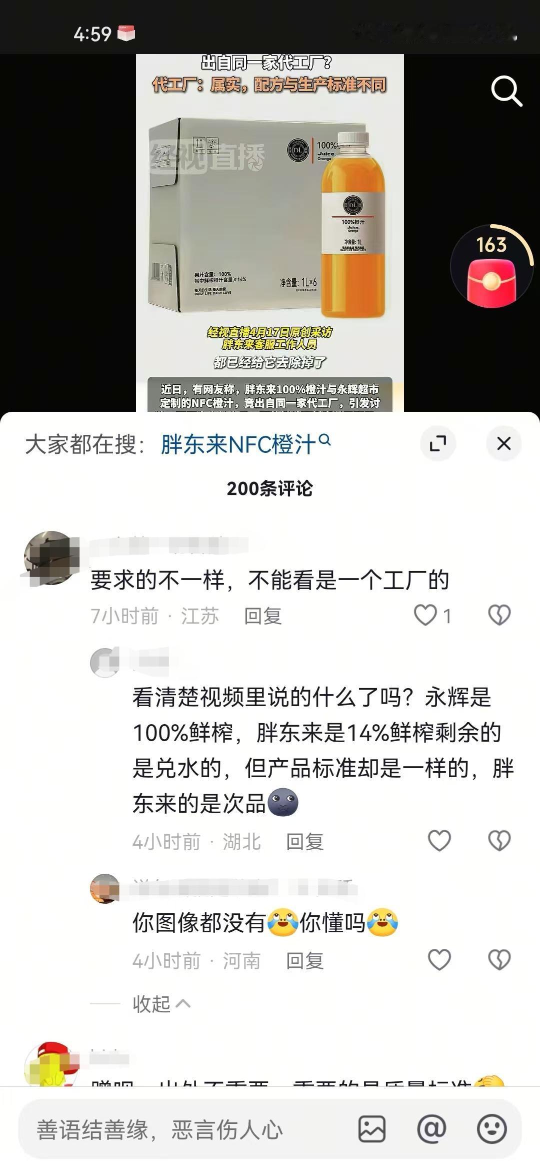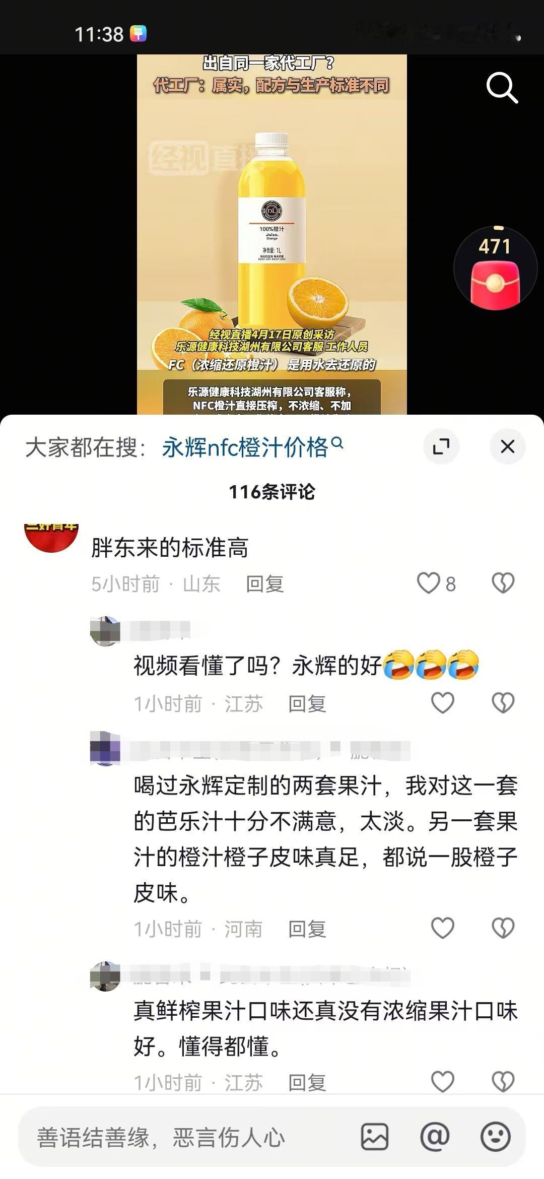 即便如此还是有不少网友不看视频内容就认定胖东来的标准更高、品质更高,有网友提出质疑鲜榨的还不如浓缩的吗,结果这些网友说浓缩果汁的口感比鲜榨的口感更好。