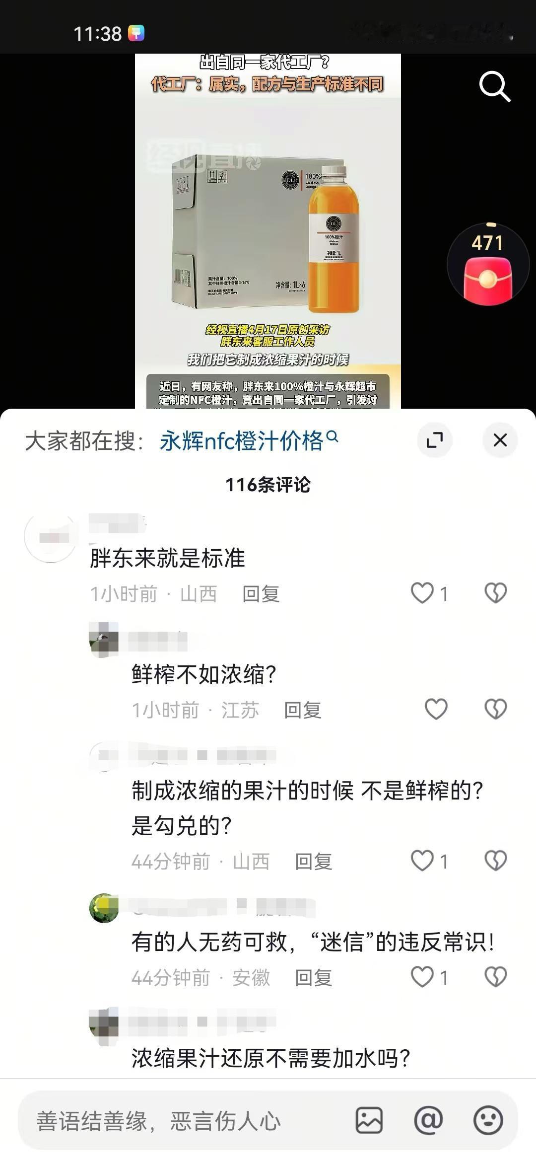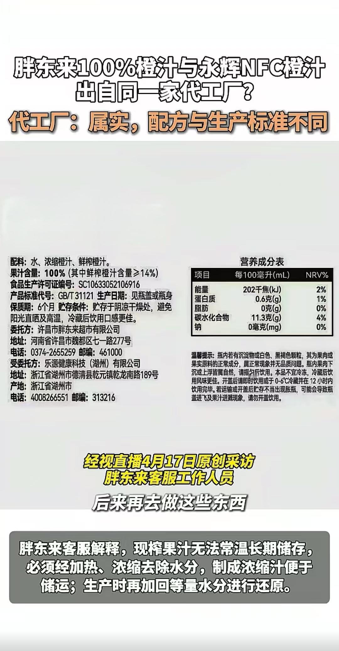 这不胖东来和永辉自营果汁用的是同一家代工厂,永辉的是100%鲜榨果汁,而胖东来是14%鲜榨,剩下的都是浓缩果汁勾兑的。