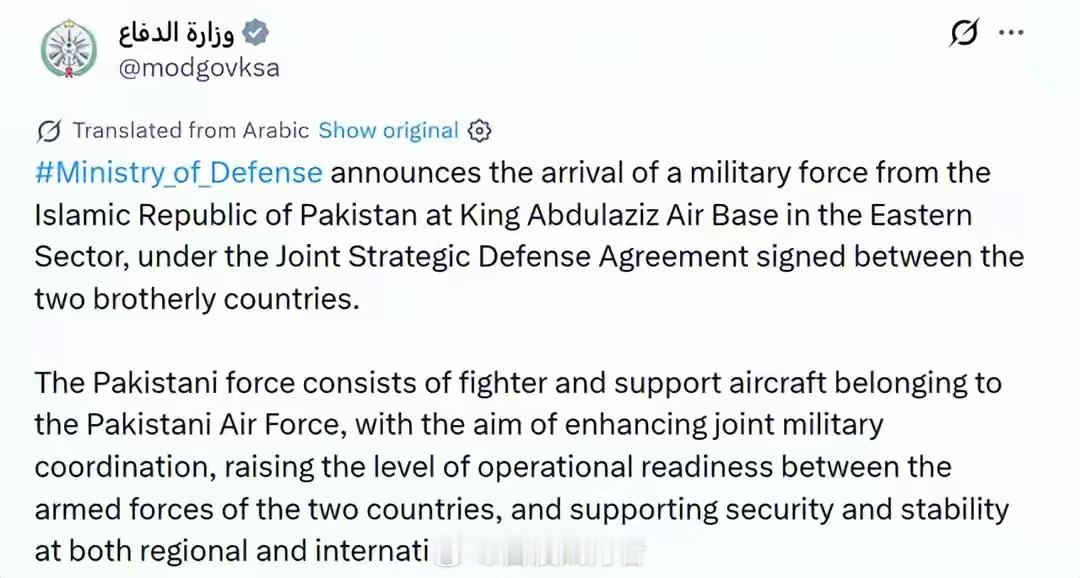 伊朗导弹撕破美盾!沙特50亿美金换新伞,巴基斯坦空军进驻波斯湾借着伊朗战争,中东国家给自己换了把“保护伞”。根据巴沙两国于2025年签署的防务协议,日前,巴基斯坦战斗机以及部分支援机型已正式部署到沙特东部军事基地,这个消息已获沙特官方的确认,称此举是为维护地区稳定。【沙特国防部声明】一,当保护伞失效:中东安全逻辑正在重写