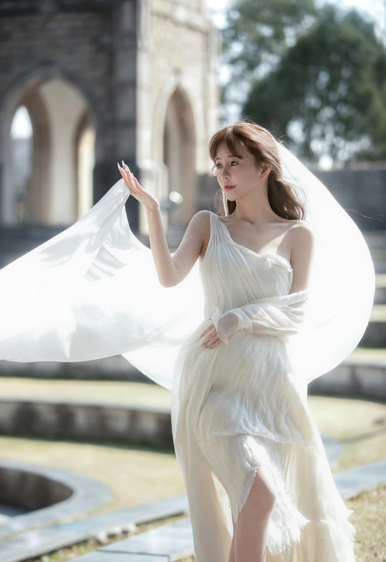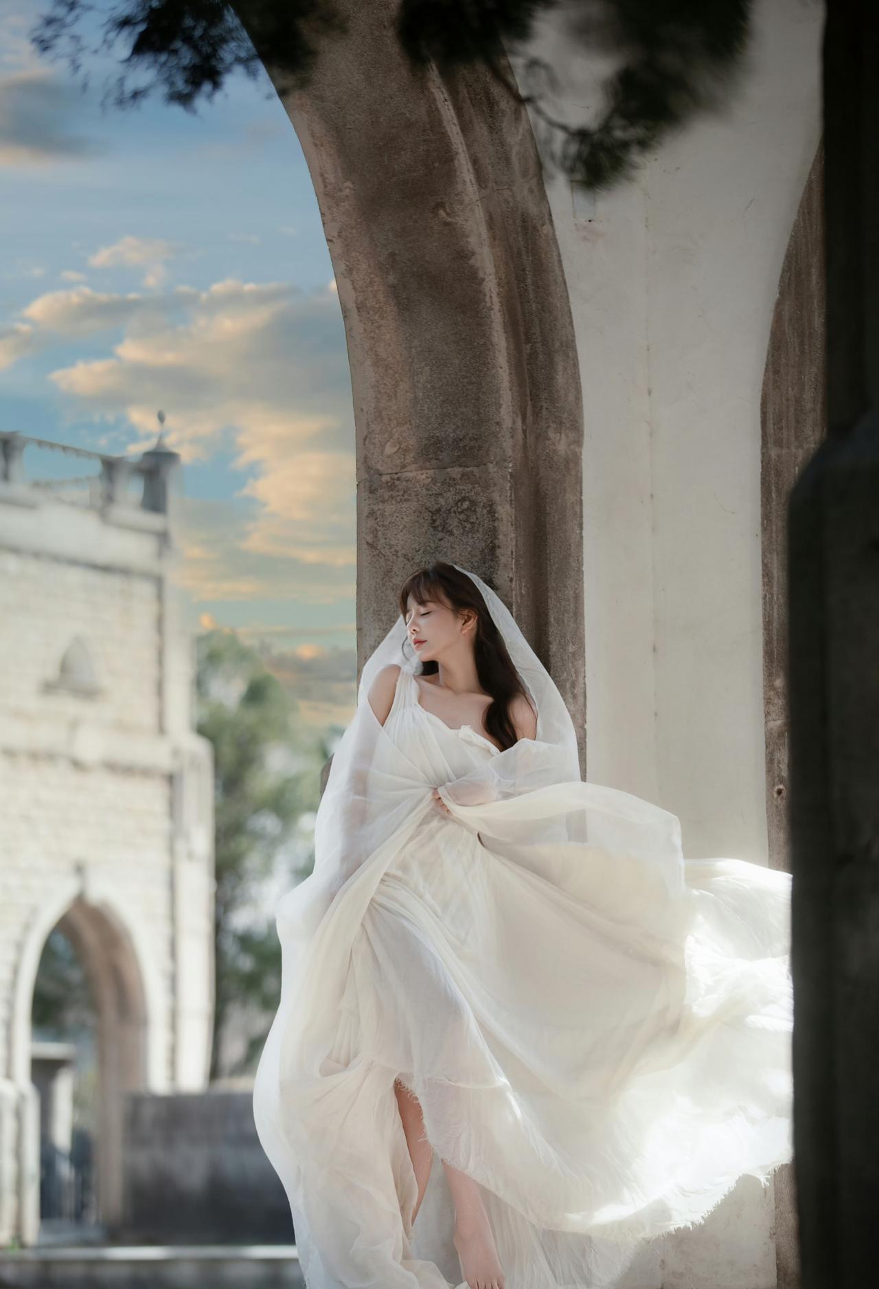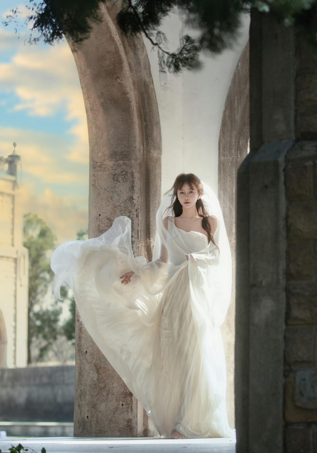 一袭飘逸的白色长裙,搭配着轻盈的头纱,这一造型被形容为“古希腊掌管浪漫的神女”,整体画面在建筑与天空的映衬下,尽显浪漫优雅的氛围,仿佛将人带入到充满梦幻与诗意的场景之中。