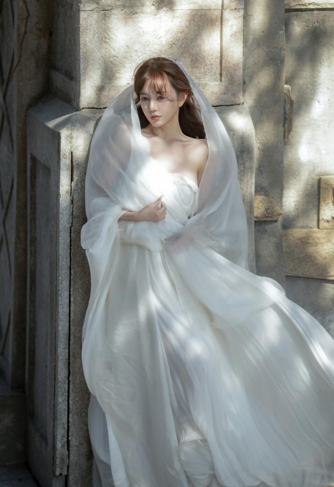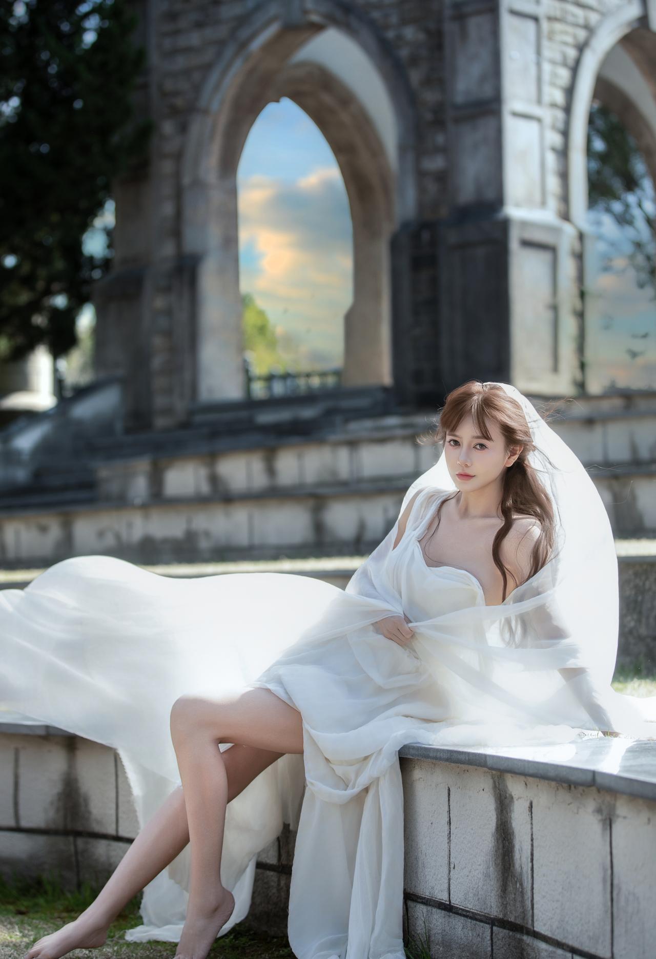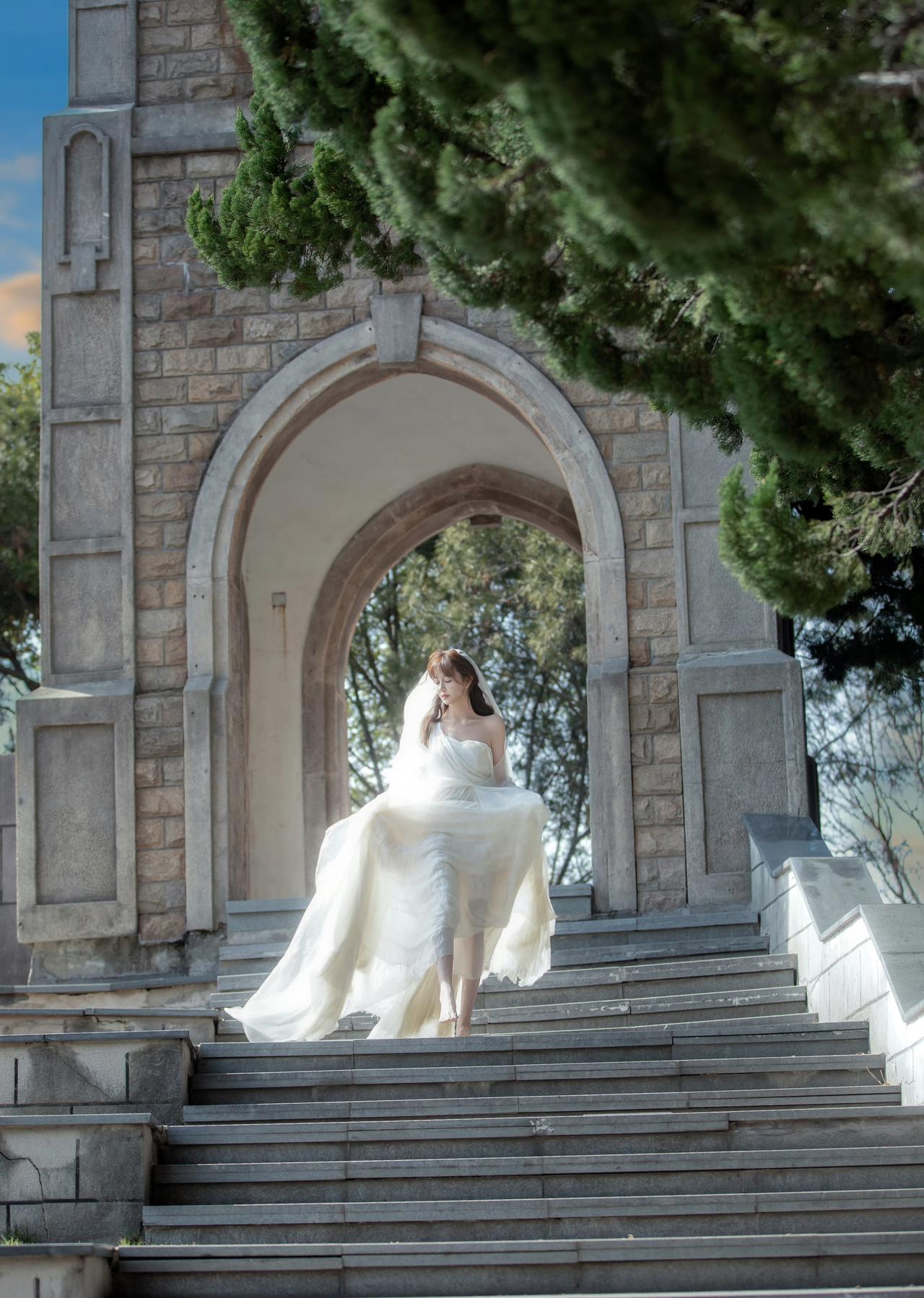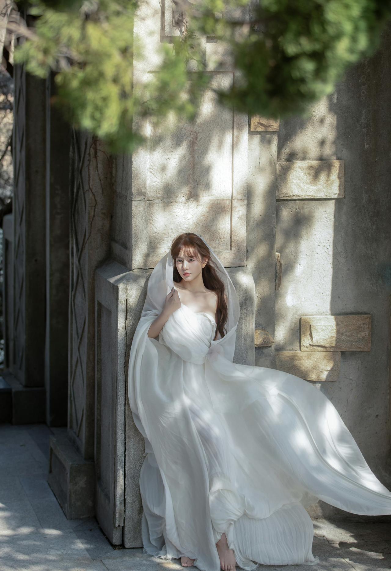 一袭飘逸的白色长裙,搭配着轻盈的头纱,这一造型被形容为“古希腊掌管浪漫的神女”,整体画面在建筑与天空的映衬下,尽显浪漫优雅的氛围,仿佛将人带入到充满梦幻与诗意的场景之中。