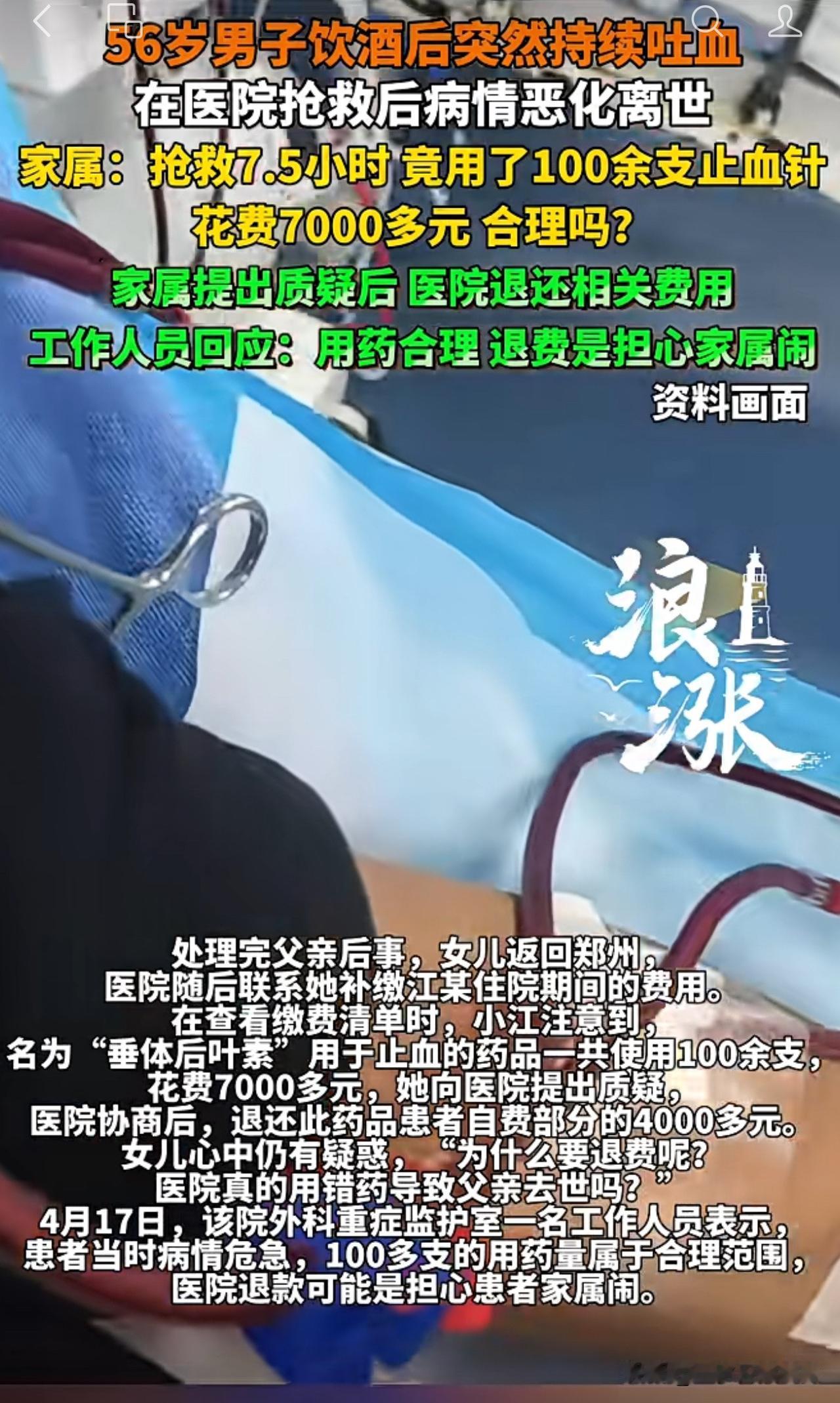 男子因抢救使用止血药100余支,花费7000多,被质疑后医院怕“闹”退还4000多?