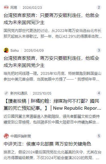 他的年轻形象、温和气质、法学专业背景,在国民党内都是稀缺品。在民进党长期执政引发政策争议与两岸关系紧张的背景下,台湾社会对稳定治理的诉求确实在上升,这也放大了蒋万安等温和中生代的影响力。