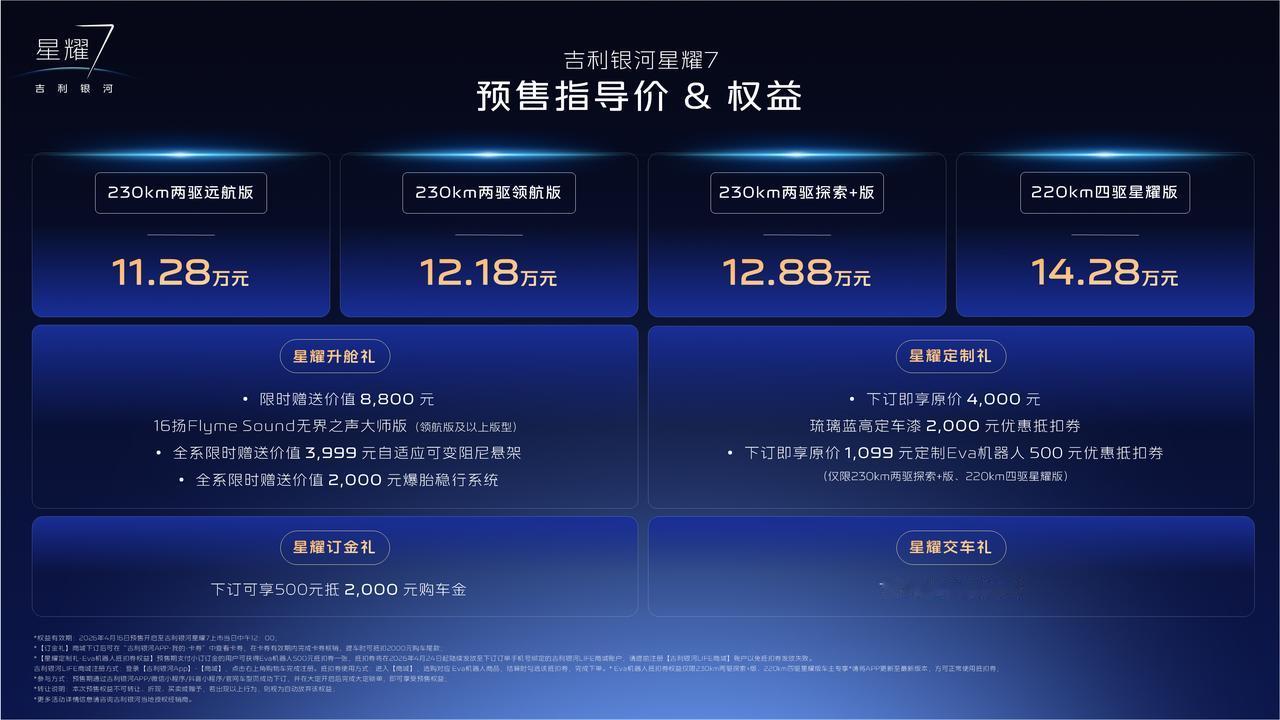《吉利银河星耀7预售11.28万起:2L级油耗四驱零百5.4秒》