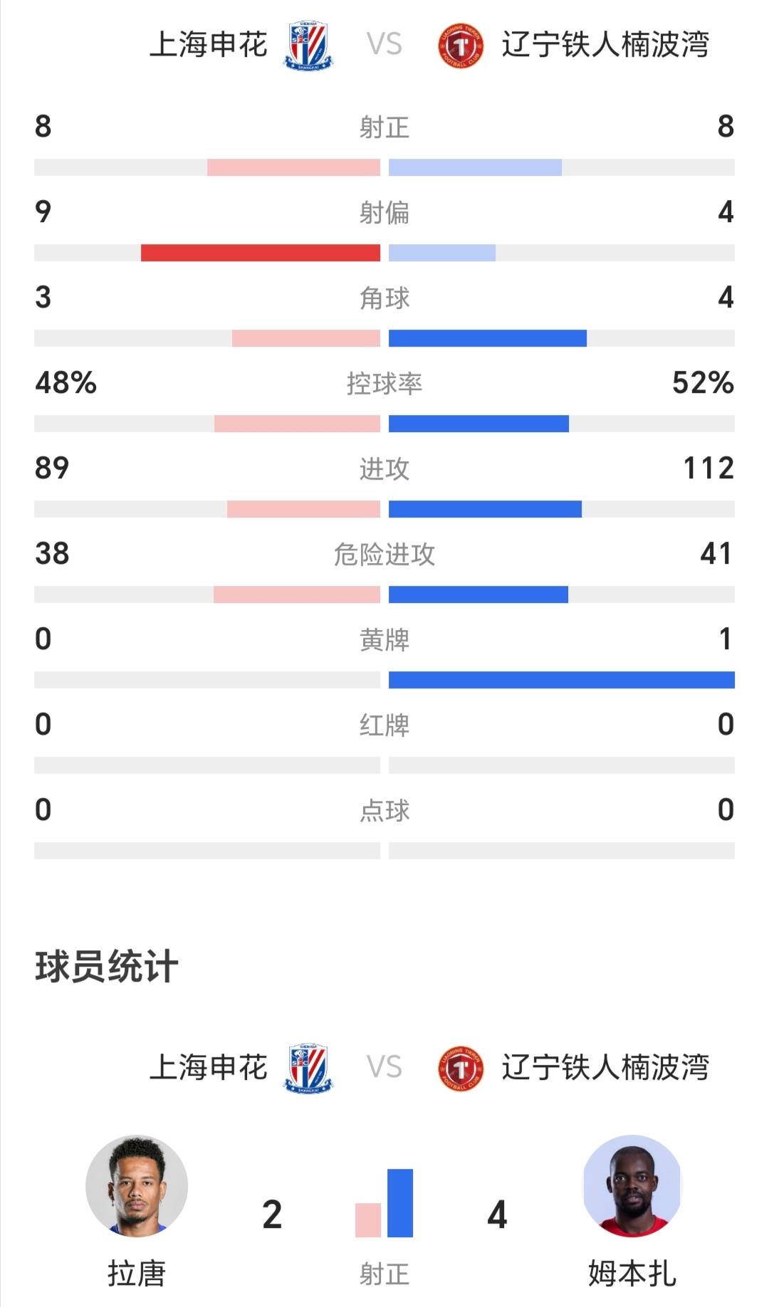 正视差距!辽宁铁人惨败上海申花,看似数据上没吃多少亏,控球和危险进攻甚至还略微占