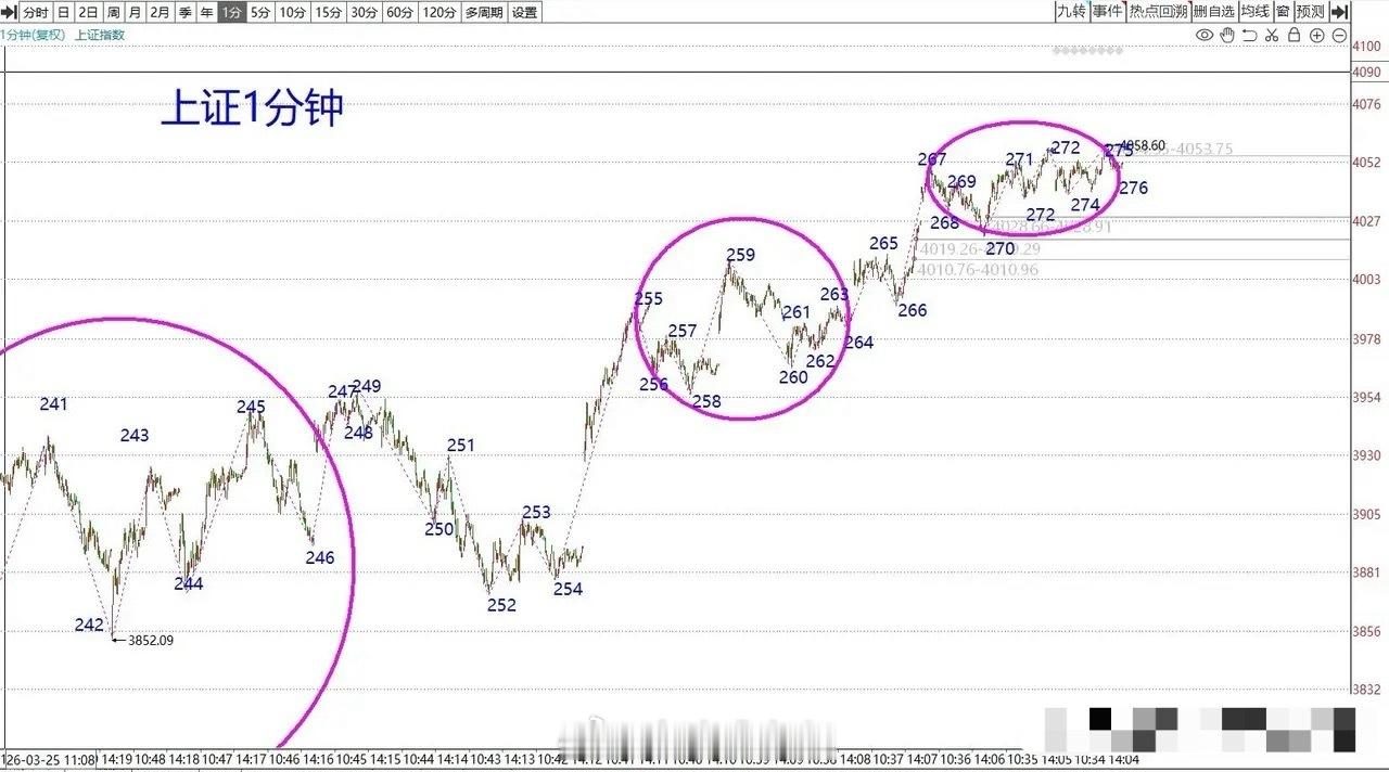 1分钟图上,底部转折后的反趋势已然形成,反弹向上已形成两个5分钟级别中枢向上排列,后续变化存在多种可能。其中,不排除出现第三个上涨中枢去突破4197点创出新高;当然,也可能出现一分钟级别趋势背驰,小转大从而形成5分钟级别转折回落。