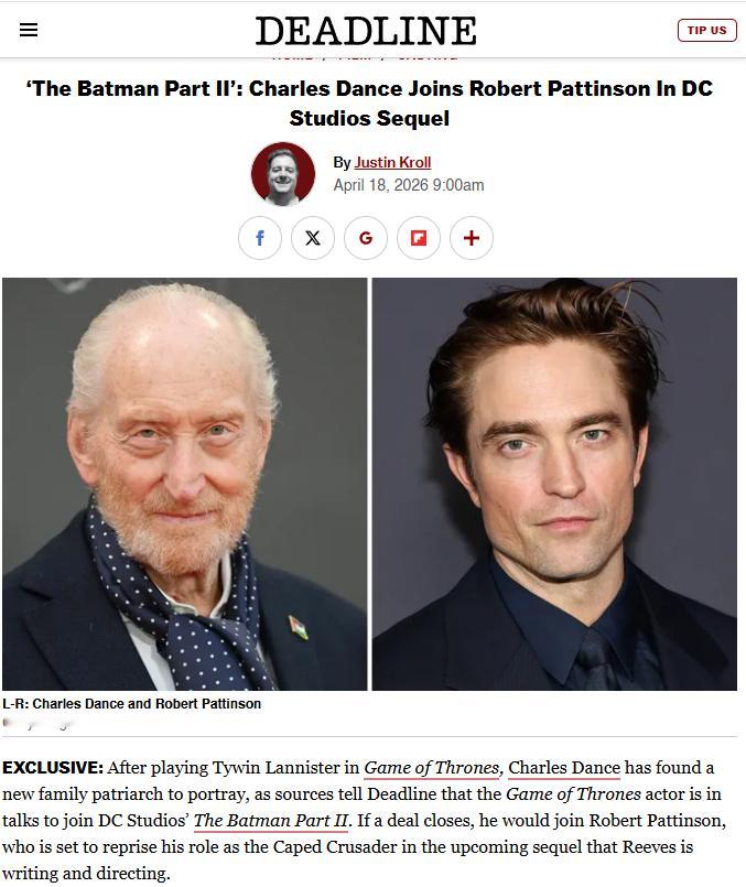 查尔斯·丹斯(Charles Dance)正在洽谈加入《新蝙蝠侠2》,极有可能饰