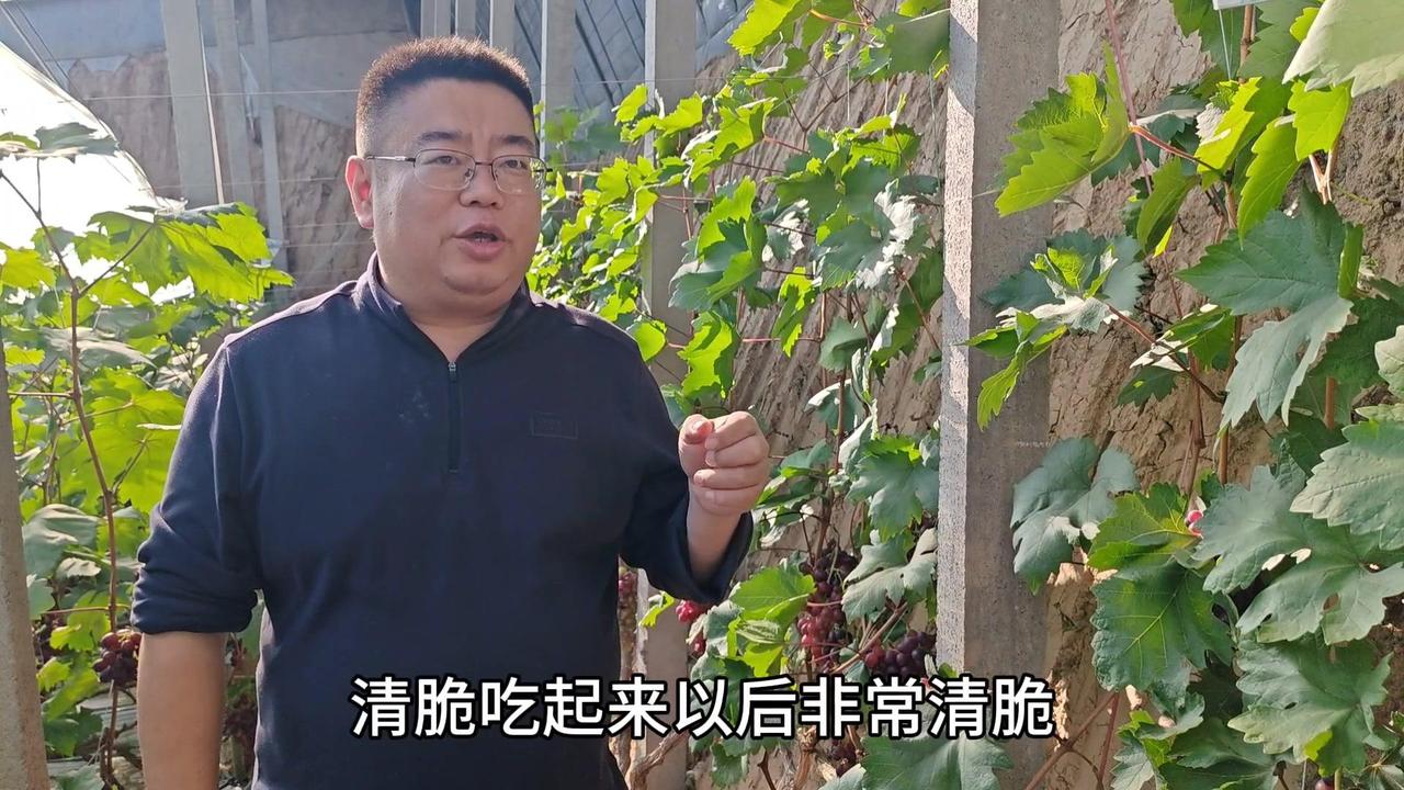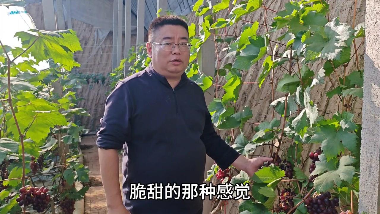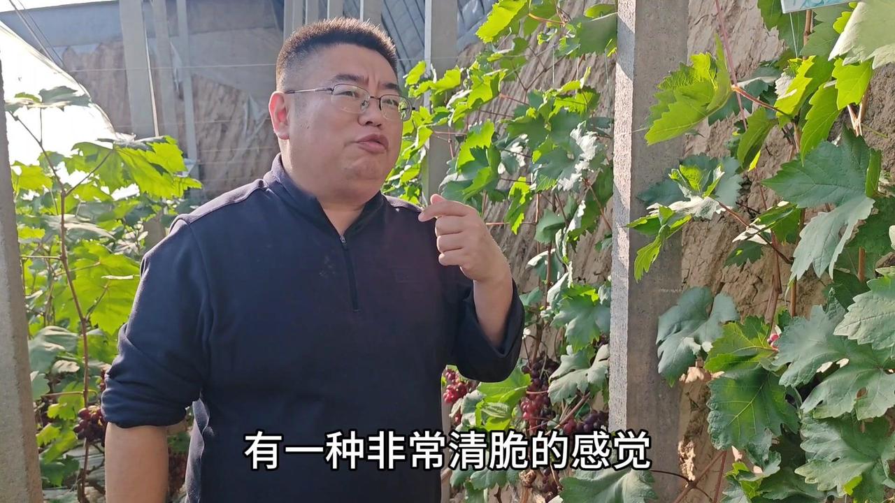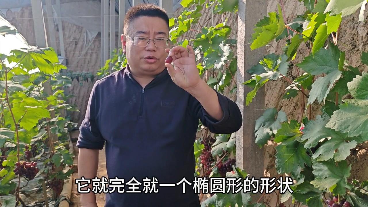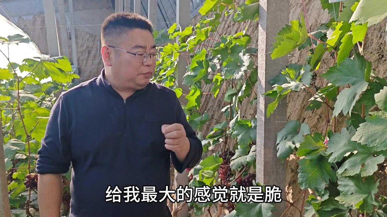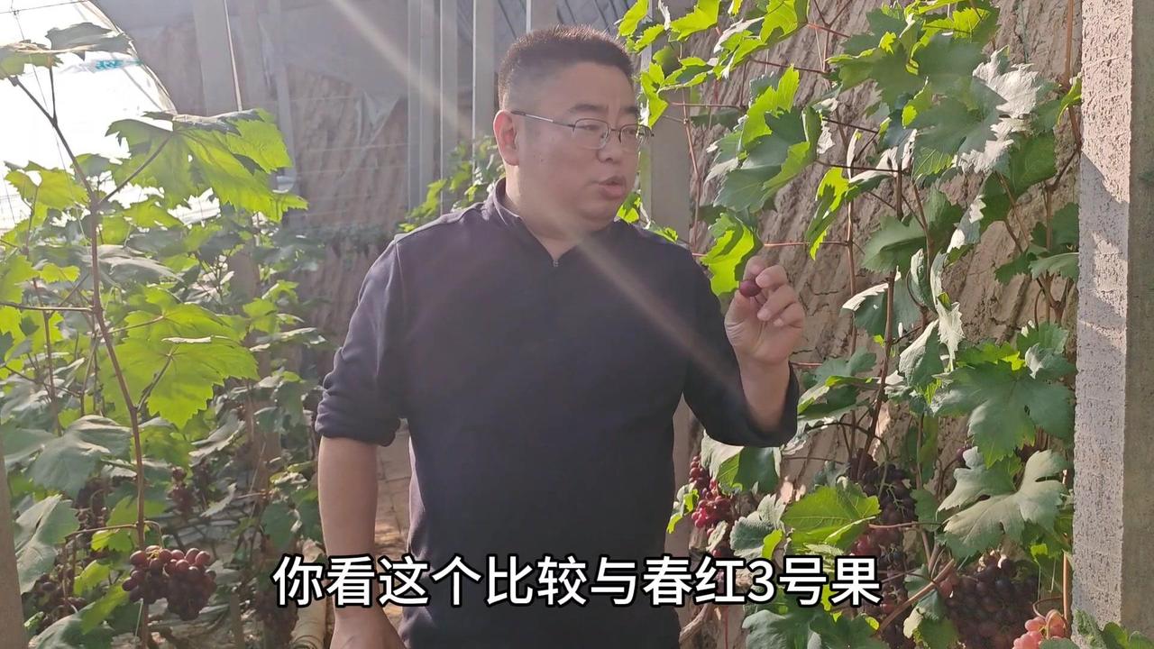 它单果粒大,不用太多修穗操作,省人工成本。果型椭圆形,颜色是喜庆的淡红紫色,上市时会变成深紫色,视觉上很吸引人。吃起来超清脆,汁水足,甜度比春红3号高,像吃甘蔗那样甜而不腻,还有小软籽但能直接吞咽,口感佳。