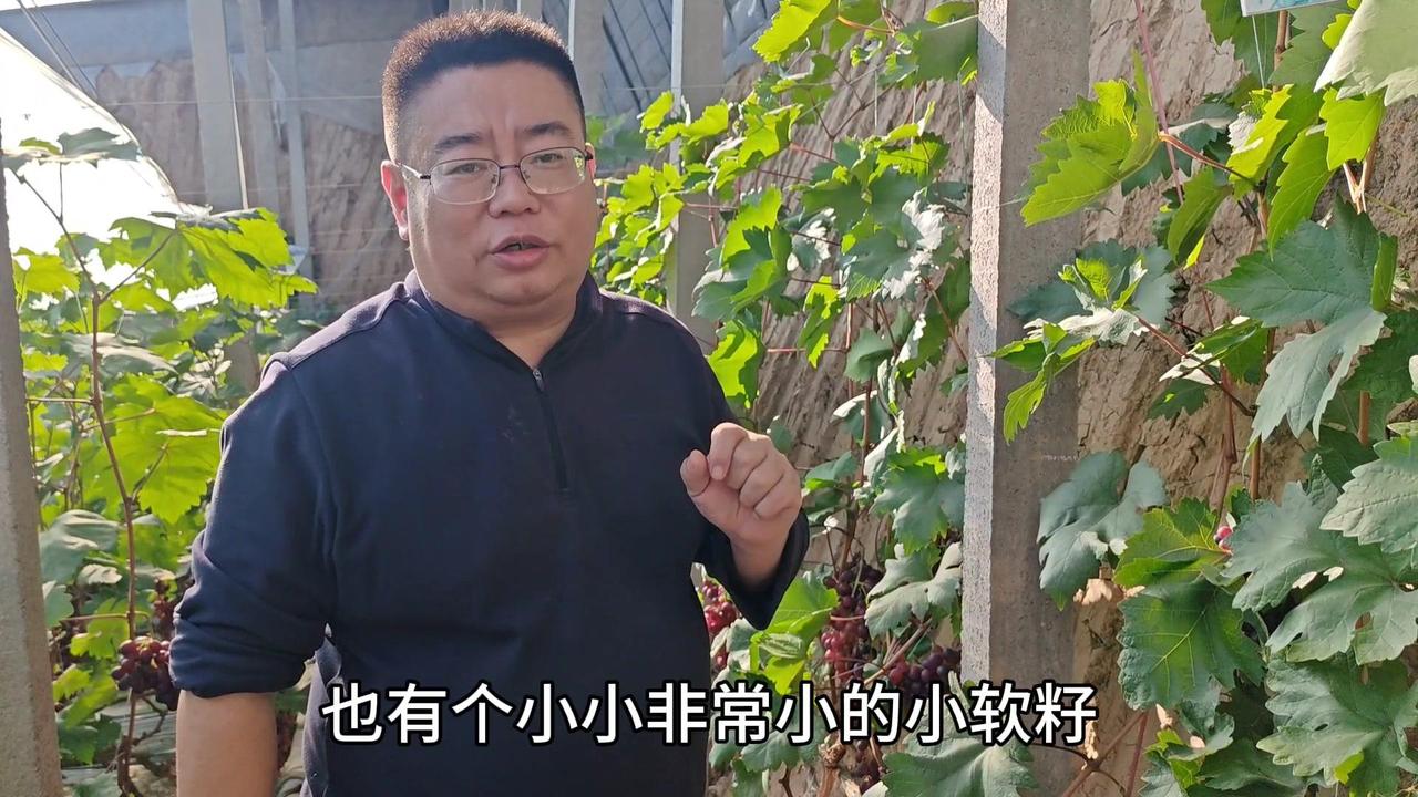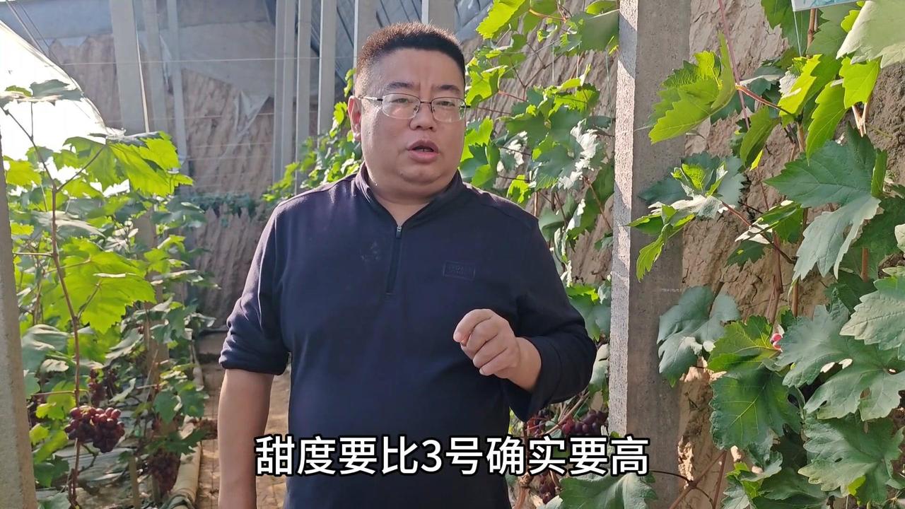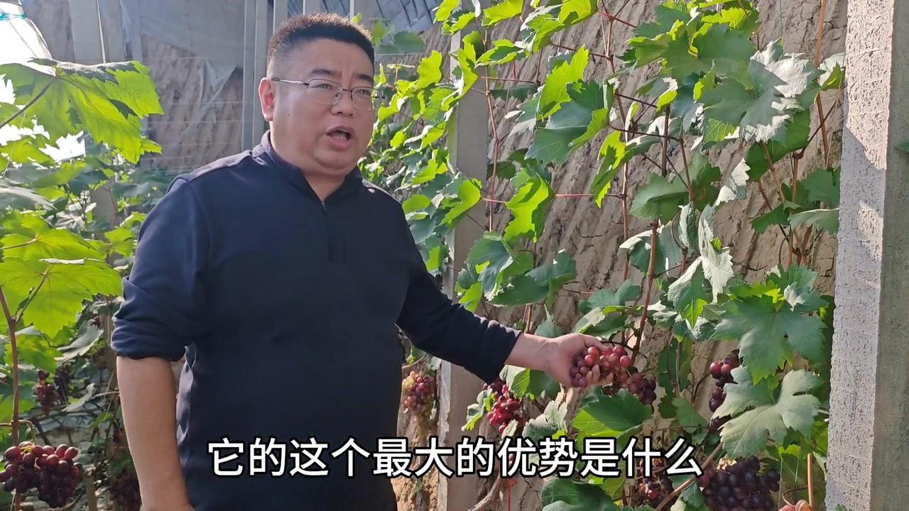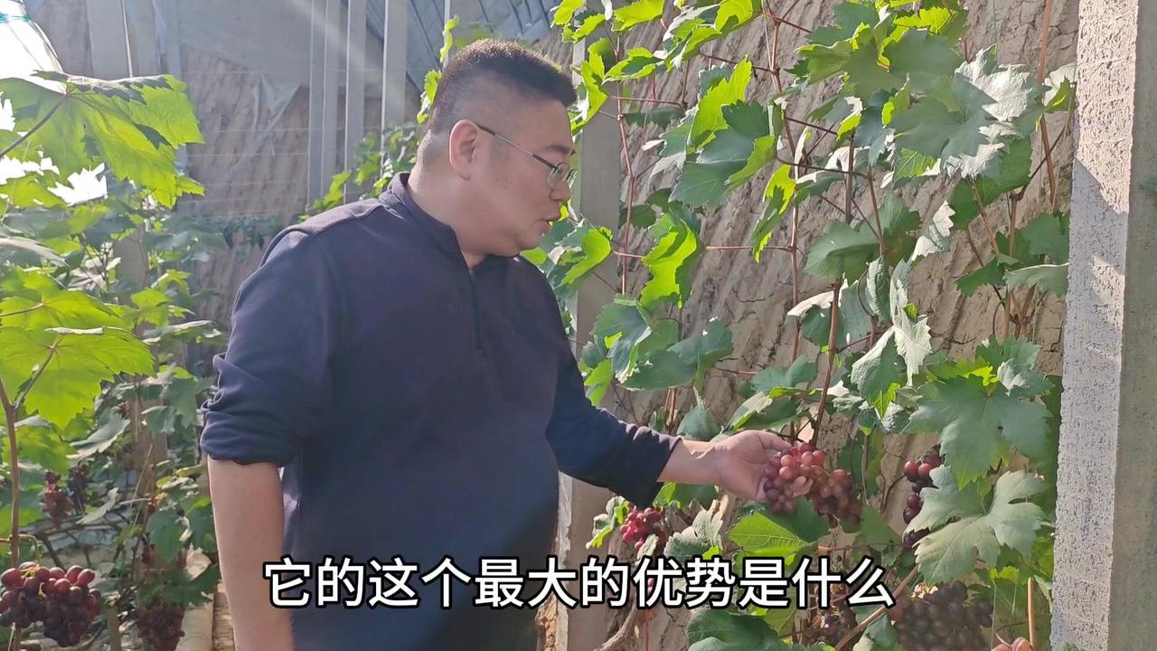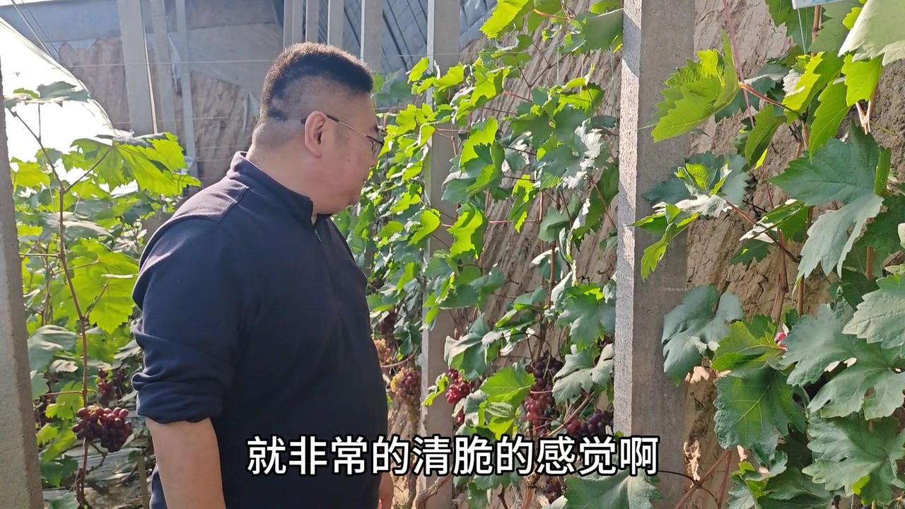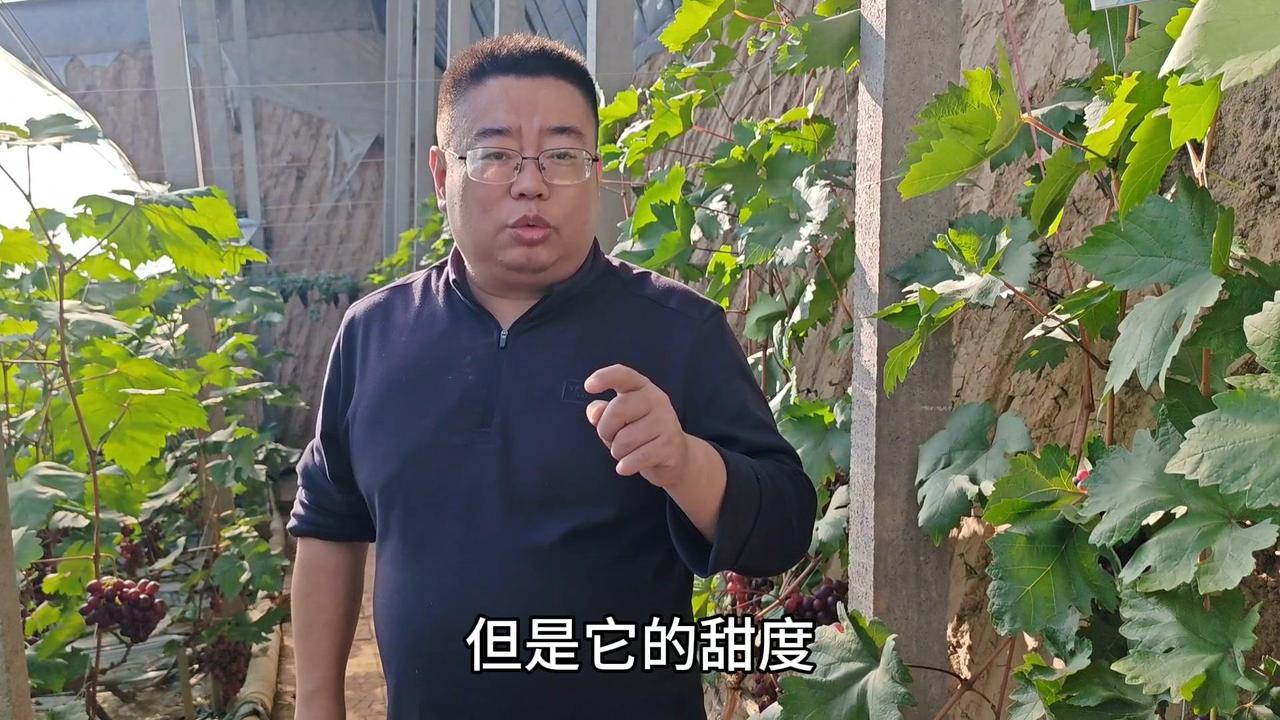 它单果粒大,不用太多修穗操作,省人工成本。果型椭圆形,颜色是喜庆的淡红紫色,上市时会变成深紫色,视觉上很吸引人。吃起来超清脆,汁水足,甜度比春红3号高,像吃甘蔗那样甜而不腻,还有小软籽但能直接吞咽,口感佳。