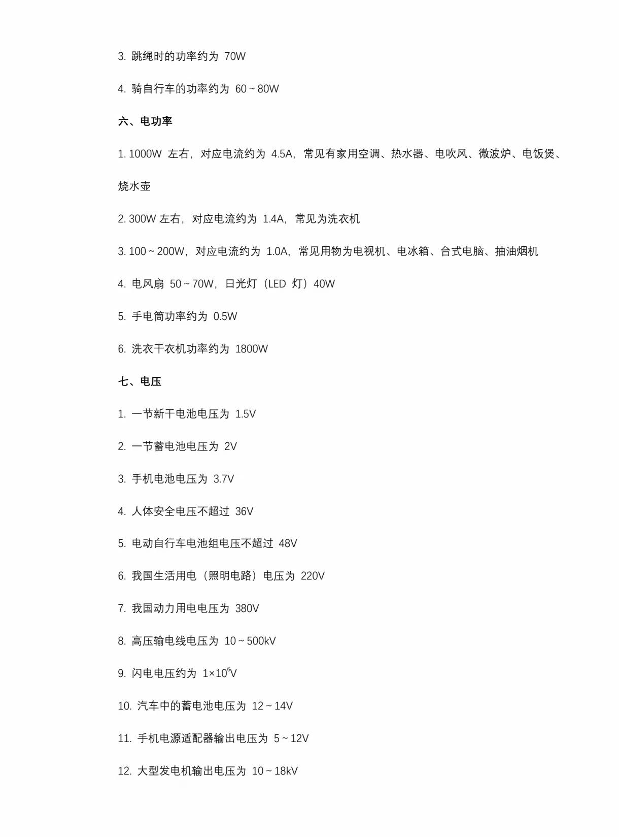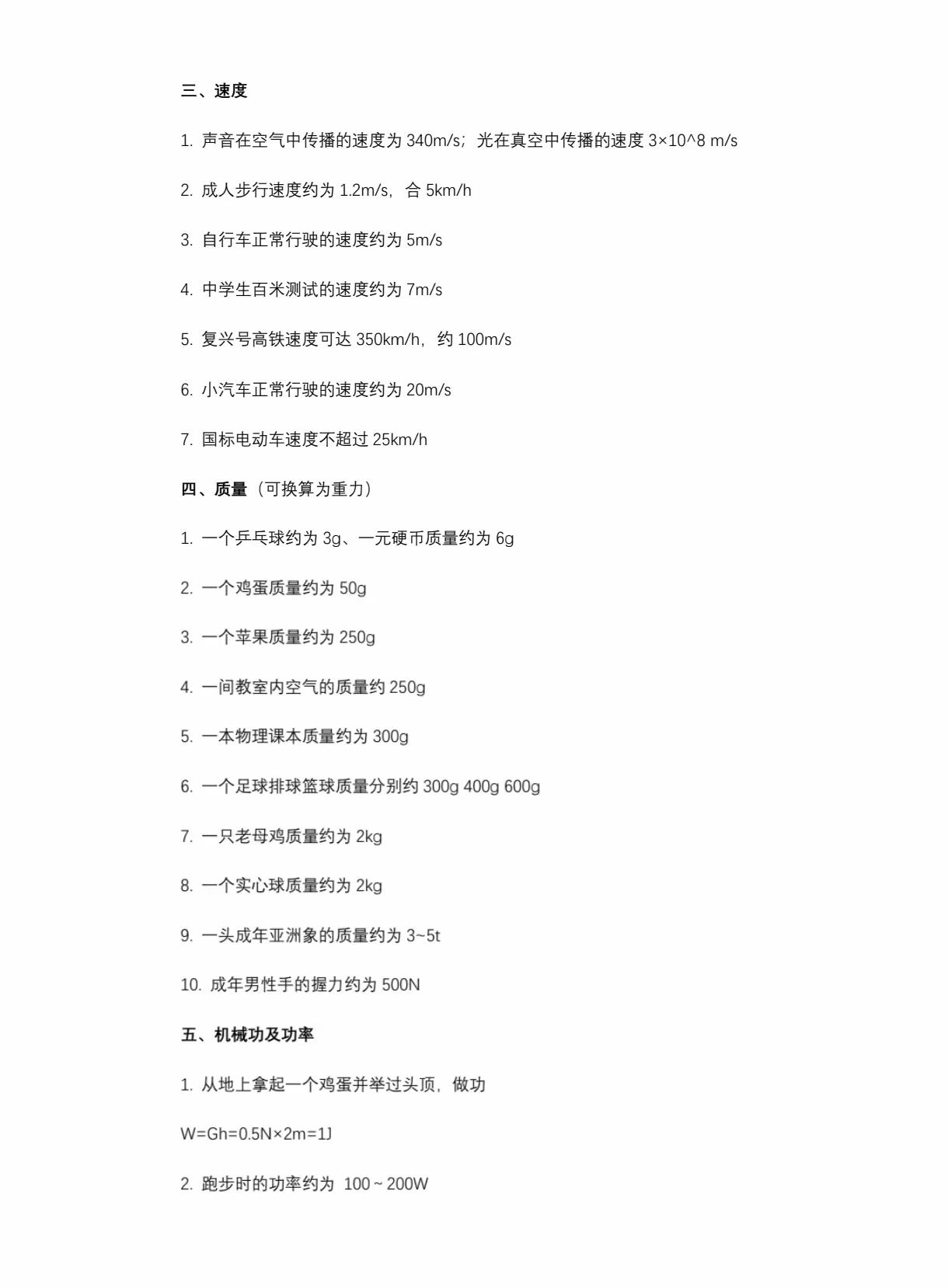 中考物理常识及估算