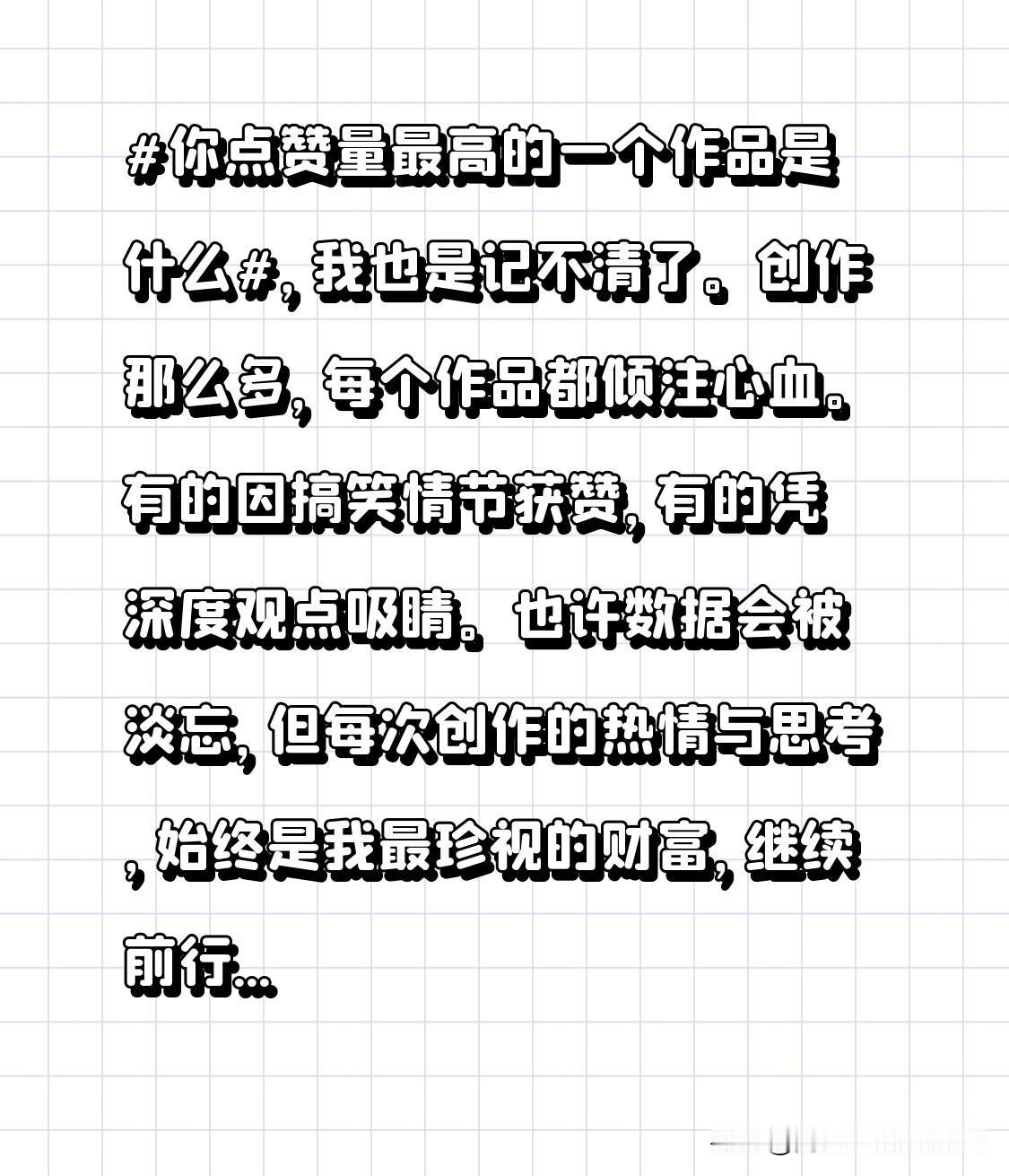 你点赞量最高的一个作品是什么,我也是记不清了。创作那么多,每个作品都倾注心血。有的因搞笑情节获赞,有的凭深度观点吸睛。也许数据会被淡忘,但每次创作的热情与思考,始终是我最珍视的财富,继续前行,期待更多精彩。