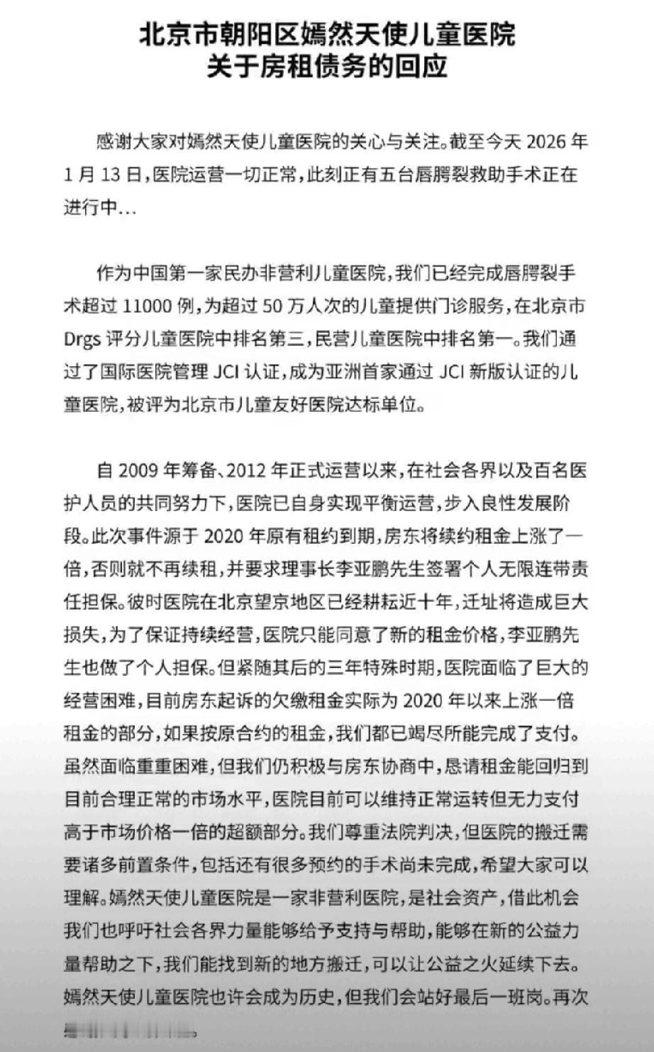 今年1月,医院还因欠2600万房租被拆招牌、面临腾退,近200名患儿手术悬而未决。疫情后门诊腰斩、租金翻倍,这家非营利医院一度撑不下去。