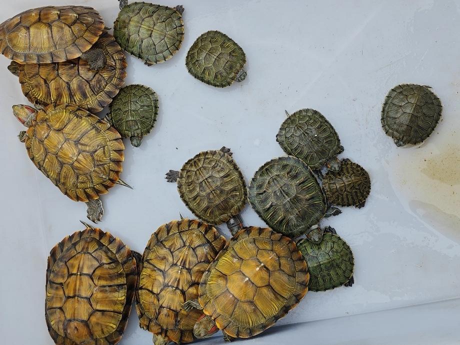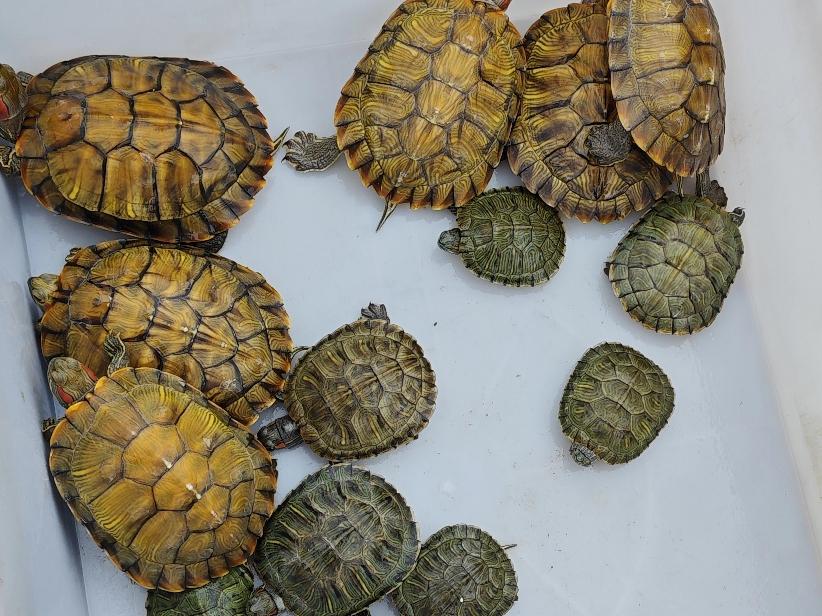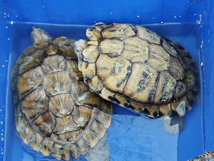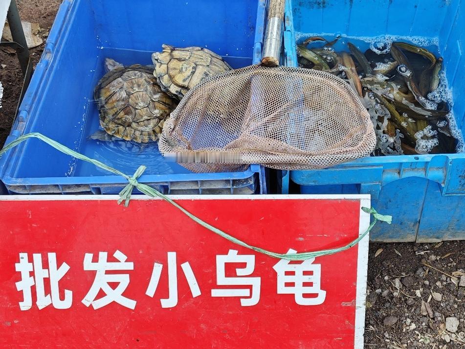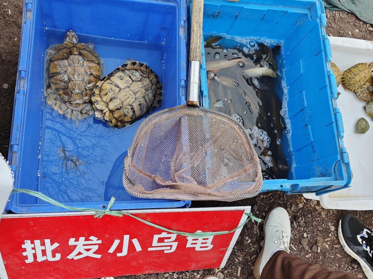我看了一下,乌龟并不多,只有2只大点的,6只次大点的,再就是8只小小的。 乌龟虽少,但围拢了好多人,从他们的询问中得知,大乌龟180元一只,次大点的乌龟15元一只,小乌龟6元一只。 不知这个价位如何?[what]