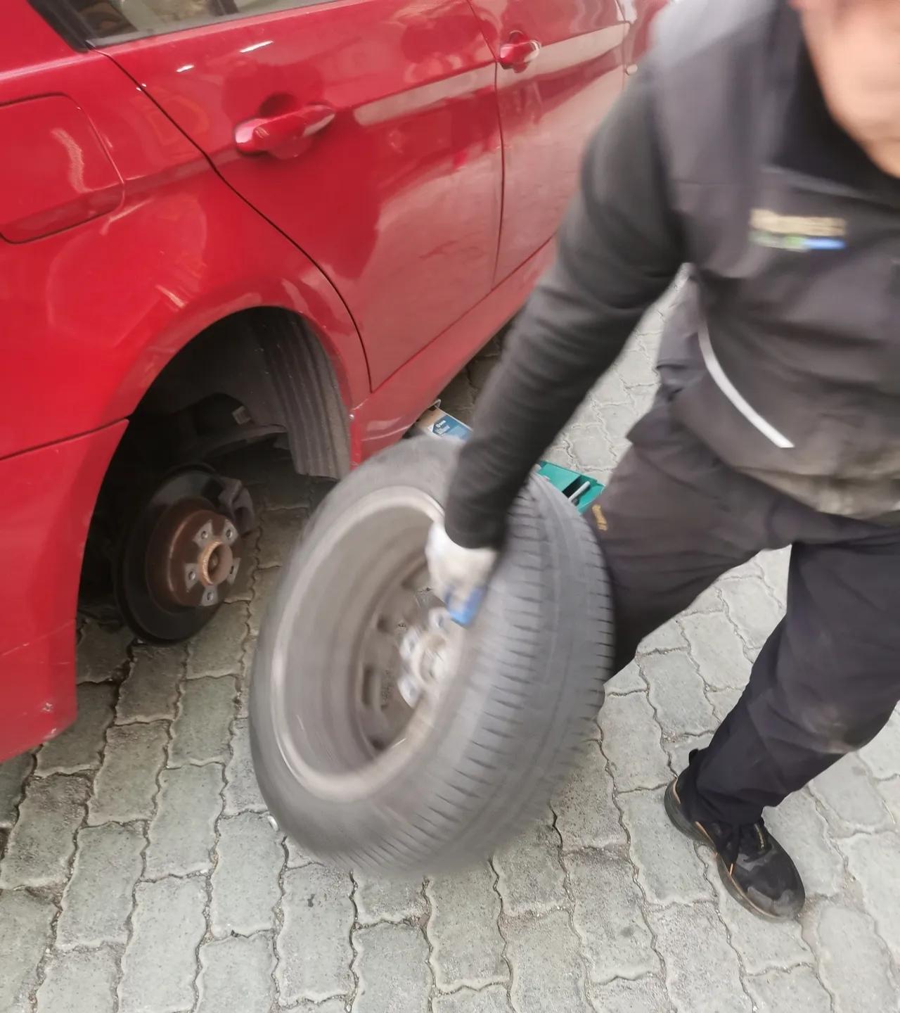 这个车的车胎质量非常好,小伙费了好大的力气才把我这个轱辘修好。