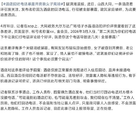 近日,有山西大同一女网友发文称因为酒店的回访电话,行程被全部暴露,致其家庭破碎,为此要追责酒店。