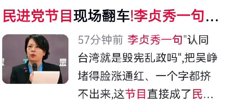 民进党邀李贞秀上节目,本想借陆配身份炒作对立、抹黑大陆,不料现场彻底翻车。李贞秀直面镜头直言“两岸都是中国人”,面对绿营刻意诱导,厉声反问“认同台湾就是毁宪乱政吗”,直接让主持人与吴峥哑口无言,场面一度失控。