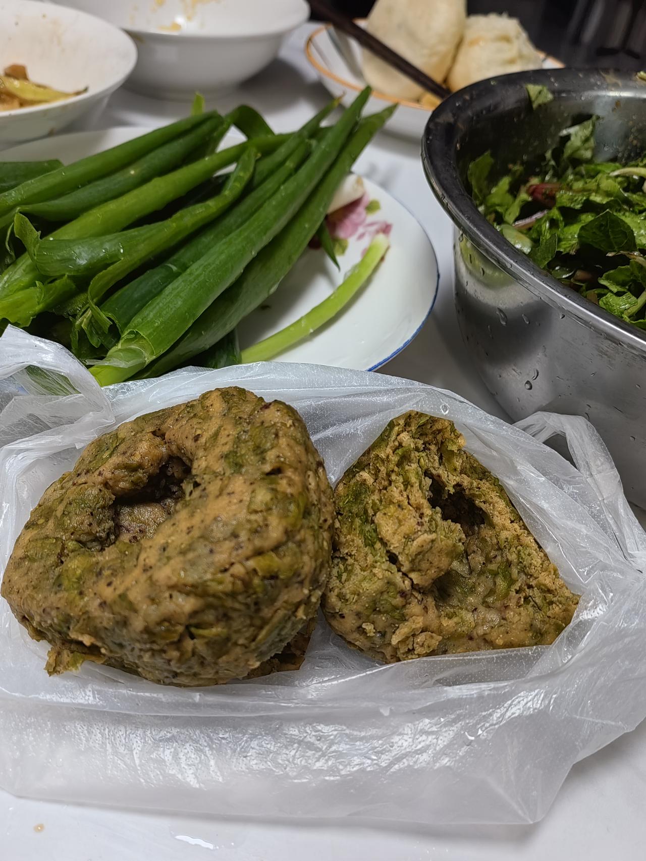 今天和面包饺子,韭菜鲅鱼馅饺子,我先吃点。午饭给老伴,菜园大哥都送点饺子吃。我先吃点东西,包子,蒲公英,大葱,吃点这些,败火啊。