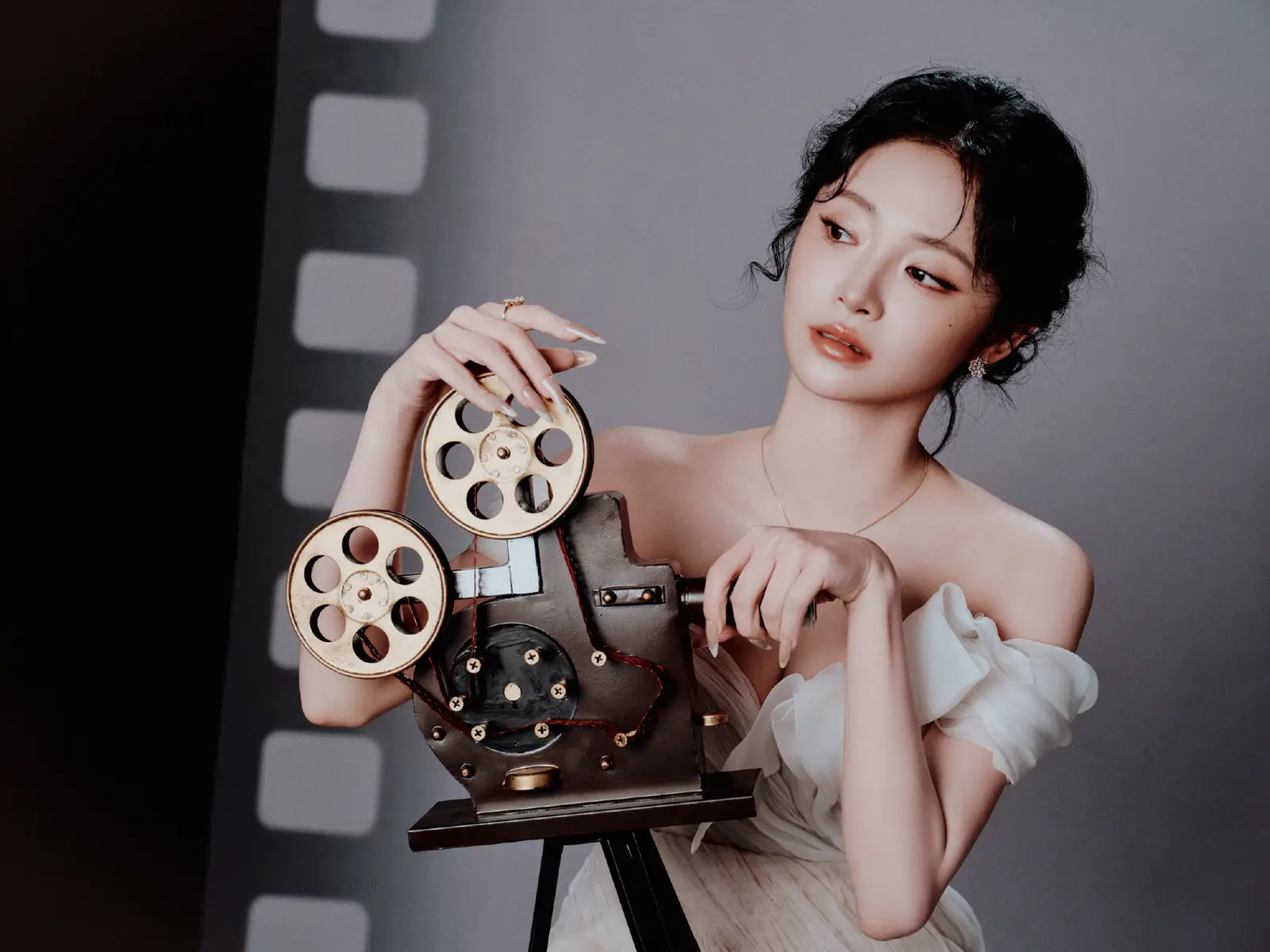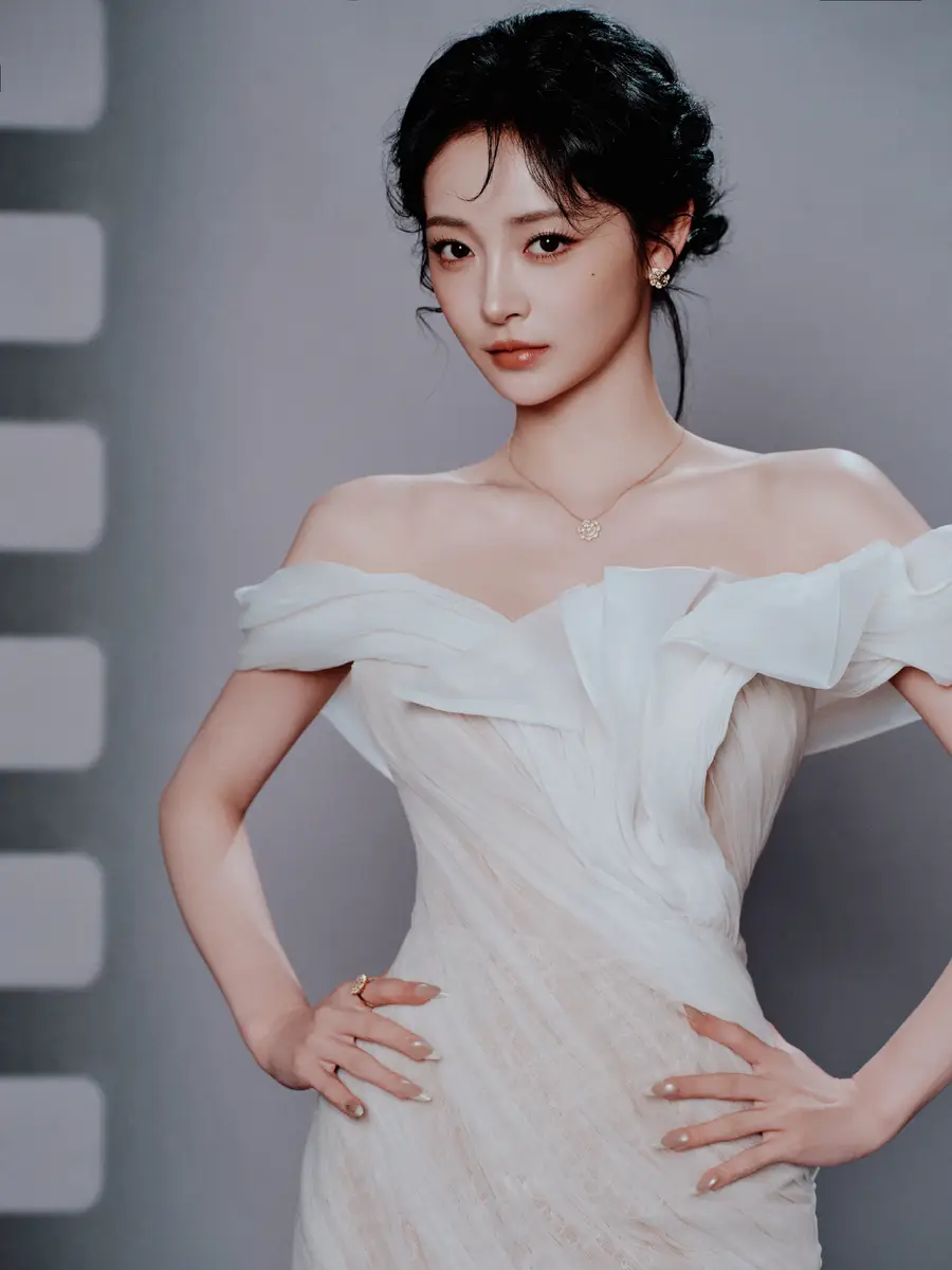 周洁琼穿白色露肩纱裙身姿曼妙,自带复古氛围感