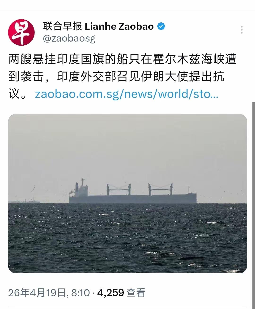印度抗议伊朗。外媒今天(4月19日)报道:“两艘悬挂印度国旗的船只在霍尔木兹海峡遭到袭击,印度外交部召见伊朗大使提出抗议。”
