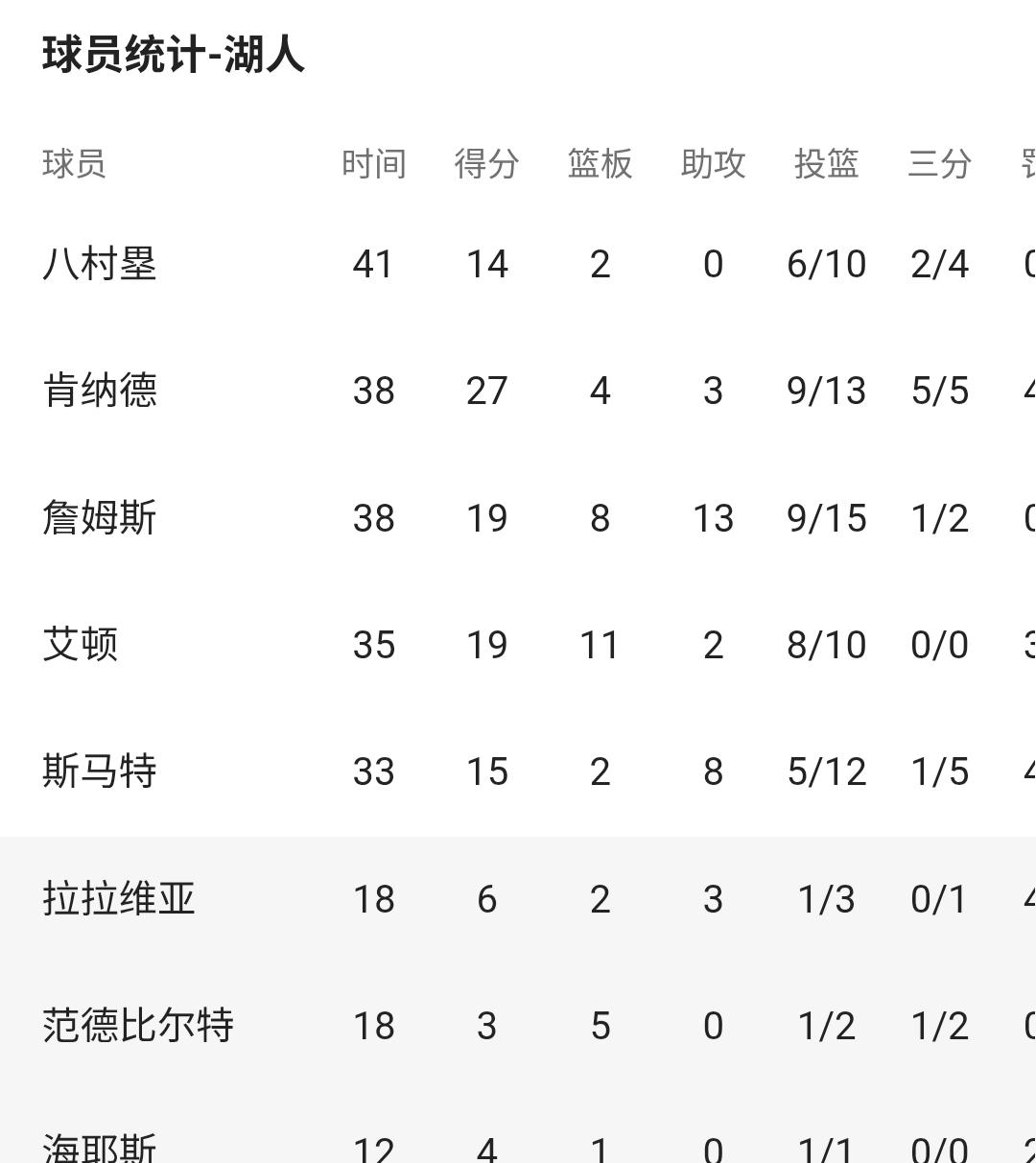 反观湖人队肯纳德发挥十分高效13投9中得到了27分4篮板3助攻,詹姆斯宝刀不老得到了19分8篮板13次助攻,就连艾顿都是10投8中得到了19分11篮板和2助攻,湖人队团队配合特别好,而火箭队不仅命中率低而且也会频频失误,更重要的是很多时候球员只会立棍单打,但却没有杜兰特那超高的命中率,所以季后赛更重要的是团队配合。