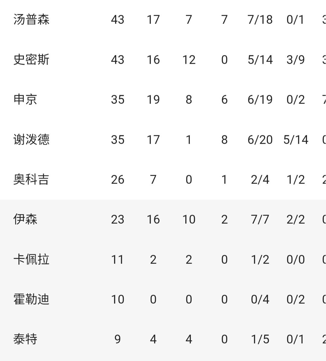 看看火箭队的命中率:申京19投6中得了19分,谢泼德20投6中得了17分,汤普森18投7中得了17分,史密斯14投5中得了16分,只有伊森发挥高效7投7中得了16分10篮板和2助攻,现在应该意识到杜兰特的重要性了吧?