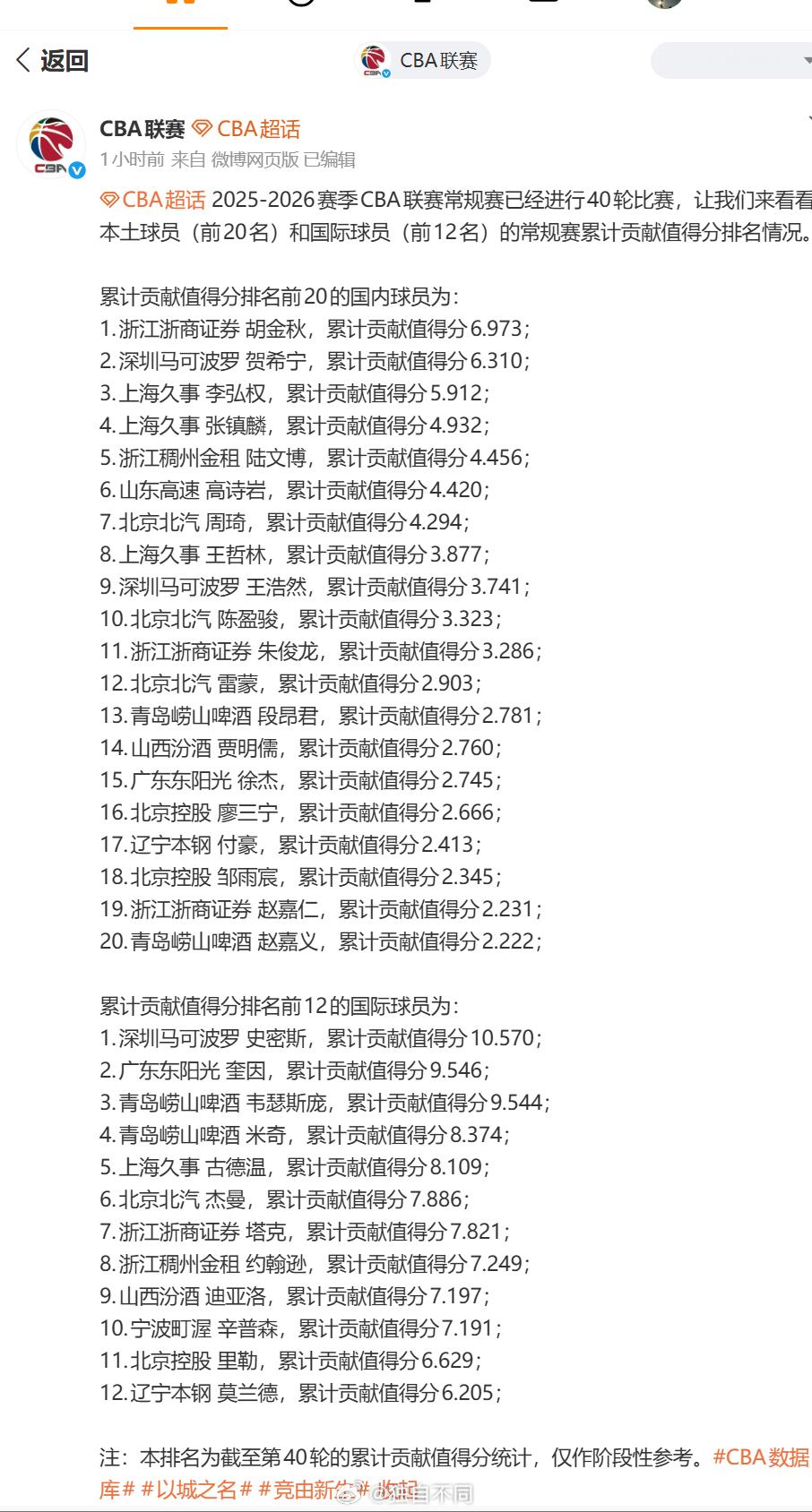 外援贡献值排行榜前五名,青岛男篮占了两席。再次从数据上印证了,韦胖和米奇这赛季在球队中扮演的关键角色。俱乐部昨天官宣了新援莱斯特·奎因奥内斯加盟,也已经于4月19日上午完成了新援的注册。不出意外,克劳福德成为了被替换掉的外援。今晚对阵北京,奎因奥内斯就将迎来青岛首秀。希望这位前勇士球员能够提供足够进攻火力,为“米胖组合”分担压力。