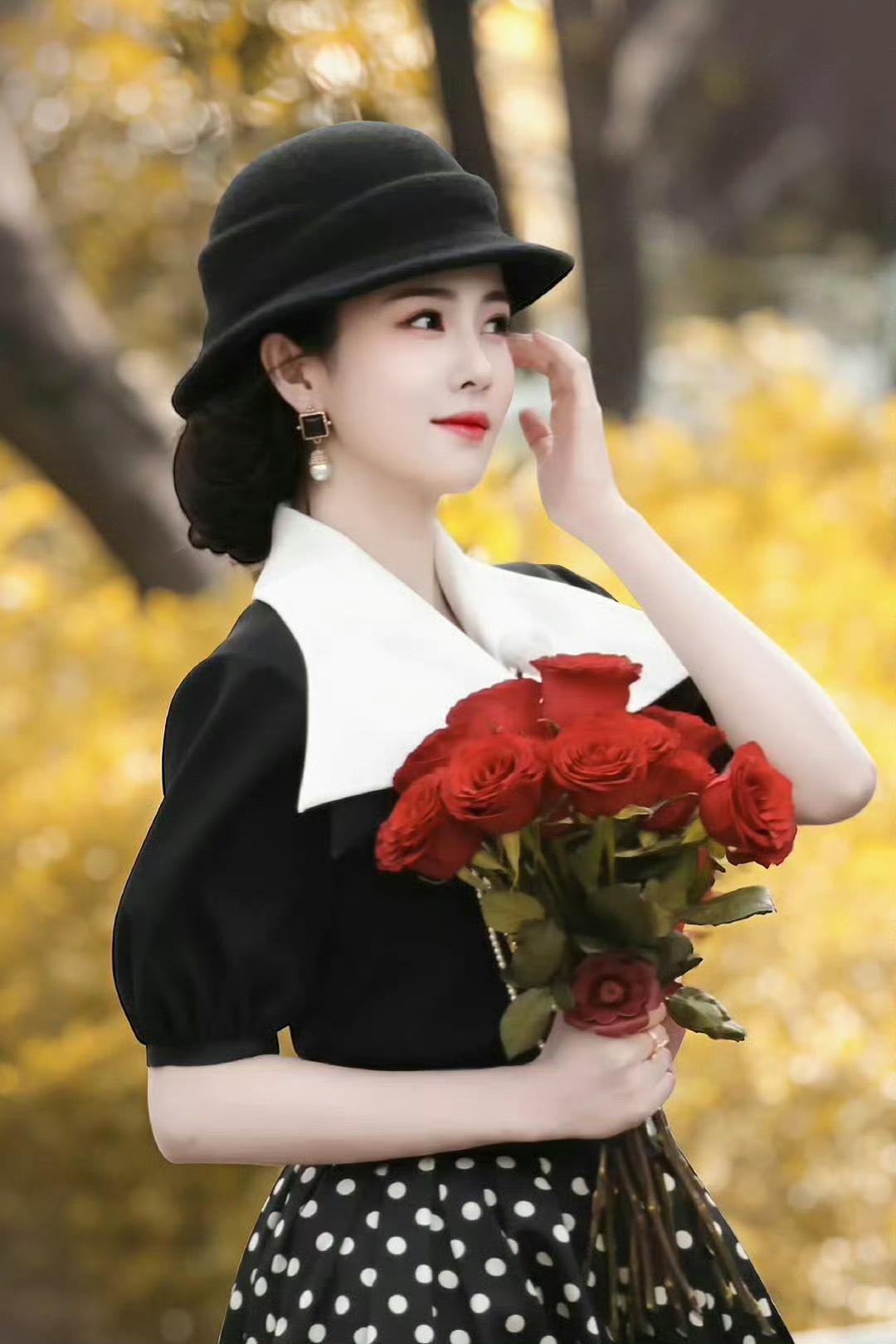 波点裙摆轻扬,玫瑰与复古礼帽相映,一整个优雅又明媚的法式氛围感。