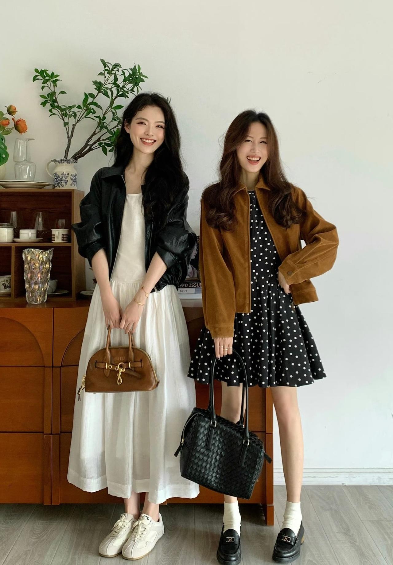 闺蜜穿搭👇👇 左边的女生穿着白色长裙搭配黑色皮夹克和白色休闲鞋,手持棕色手提包; 右边的女生则是黑底白点连衣裙外搭棕色夹克,搭配黑色皮鞋与白色袜子。 整体风格简约时尚,展现出春日通勤的老钱风穿搭魅力。