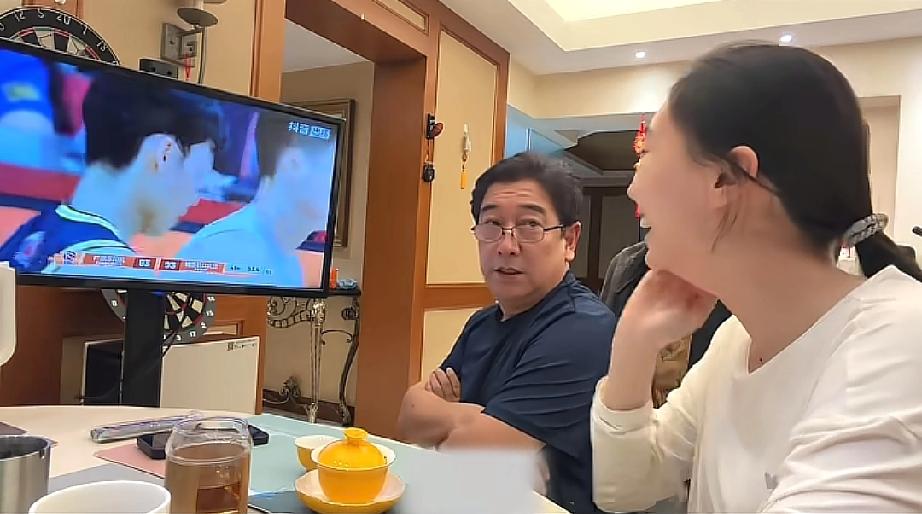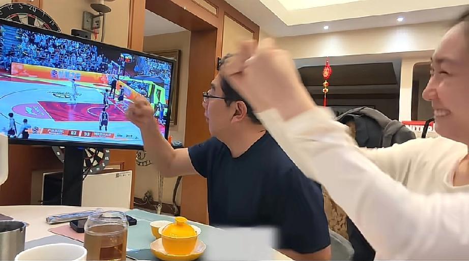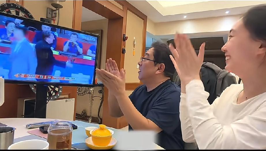 水均益和女儿水亦诗不愧都是主持人,一边看球赛一边还解说,两人虽没有去现场,但看得都是紧张得不行,水均益更是全程眼睛都盯着电视机。