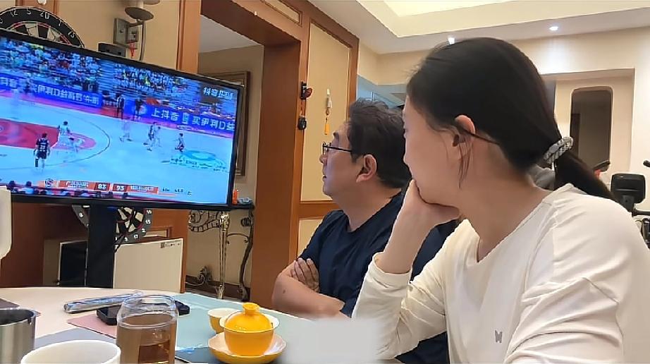 水均益和女儿水亦诗一起看女婿的篮球比赛,其女婿邹阳是CBA职业篮球运动员,最近在广州比赛,水均益父女俩就在电视机前给邹阳加油打气。
