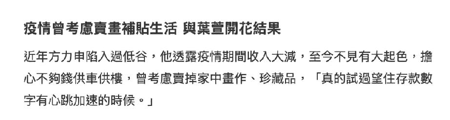 名下5000万港元豪宅背负数千万房贷,还有车贷压力,让他现金流紧张,甚至一度考虑卖掉收藏多年的名画藏品套现还贷。
