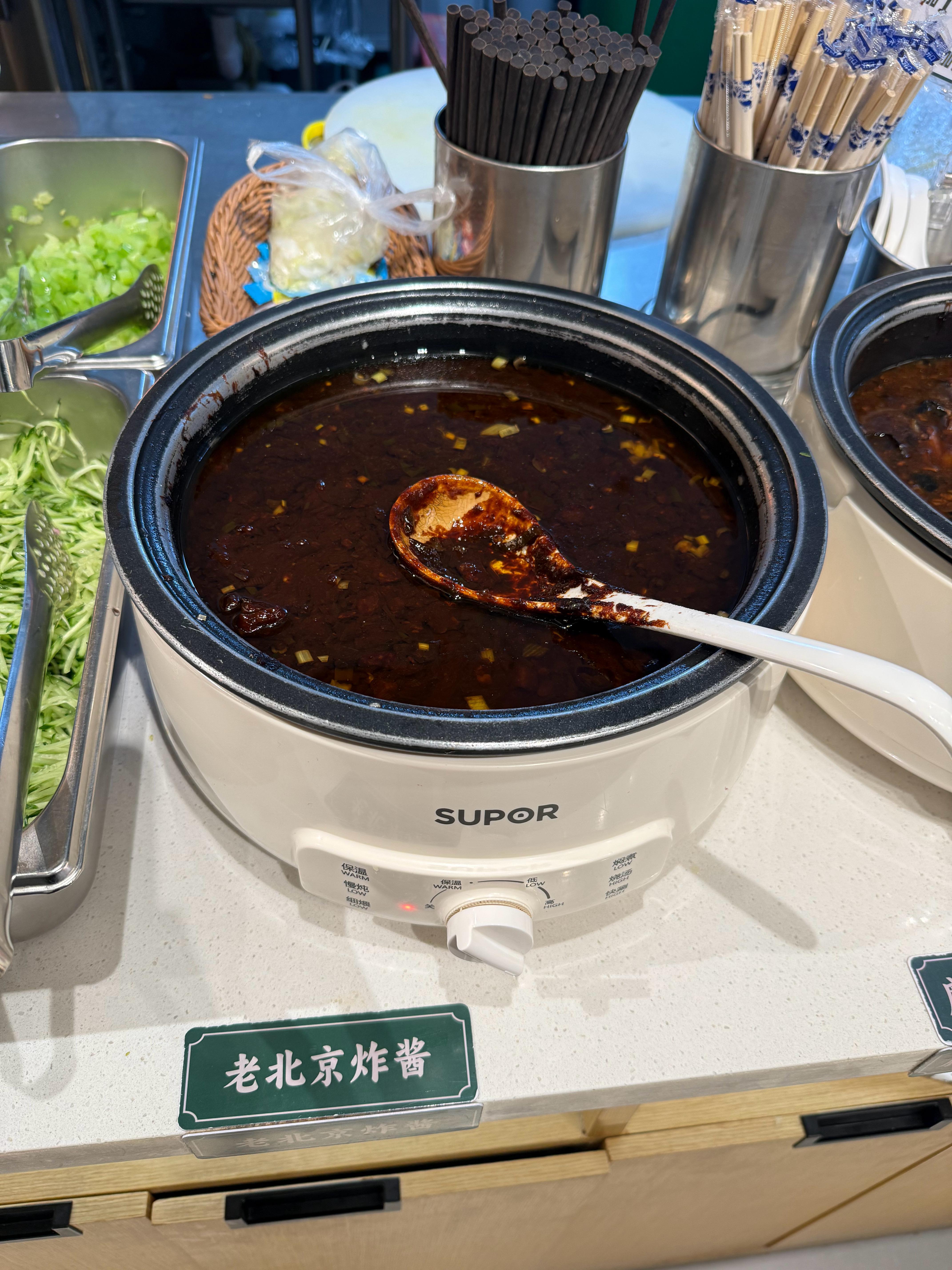 28块钱吃一碗北京面攻略:拿一小空碗,从大碗里把过水面条挑小碗里,分批次品尝:肉炸酱,香菇炸酱,茄丁卤,鸡蛋西红柿卤,木须卤。兑点儿爆辣鸡蛋炸酱调味。绝!