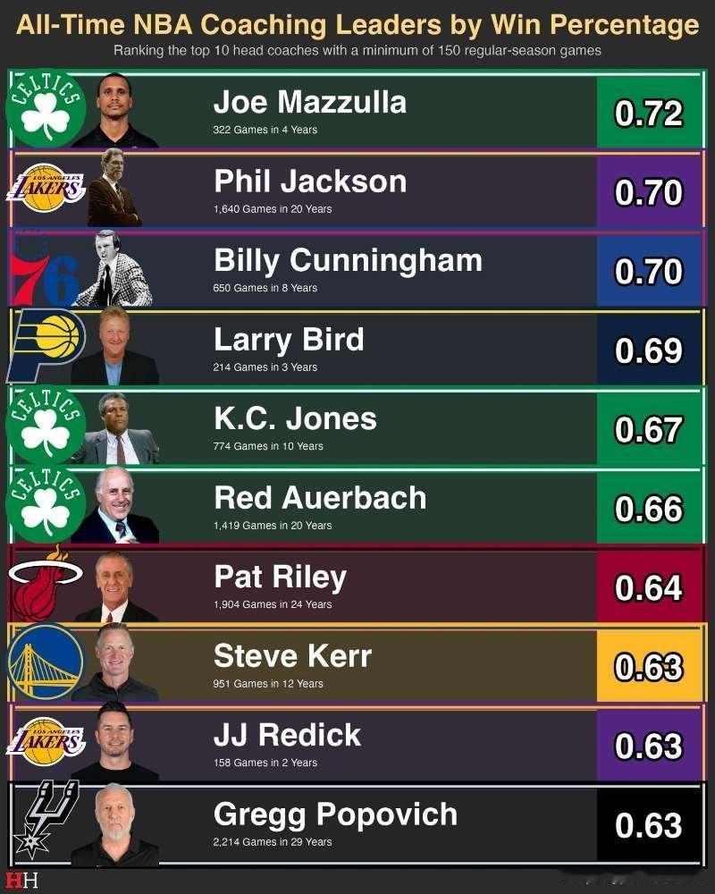在至少带队150场的情况下,NBA历史上这些教练们的执教胜率排行:马祖拉凭借着这4个赛季的优异成绩,以72%的胜率排名第一!波士顿凯尔特人凯尔特人热爱日记
